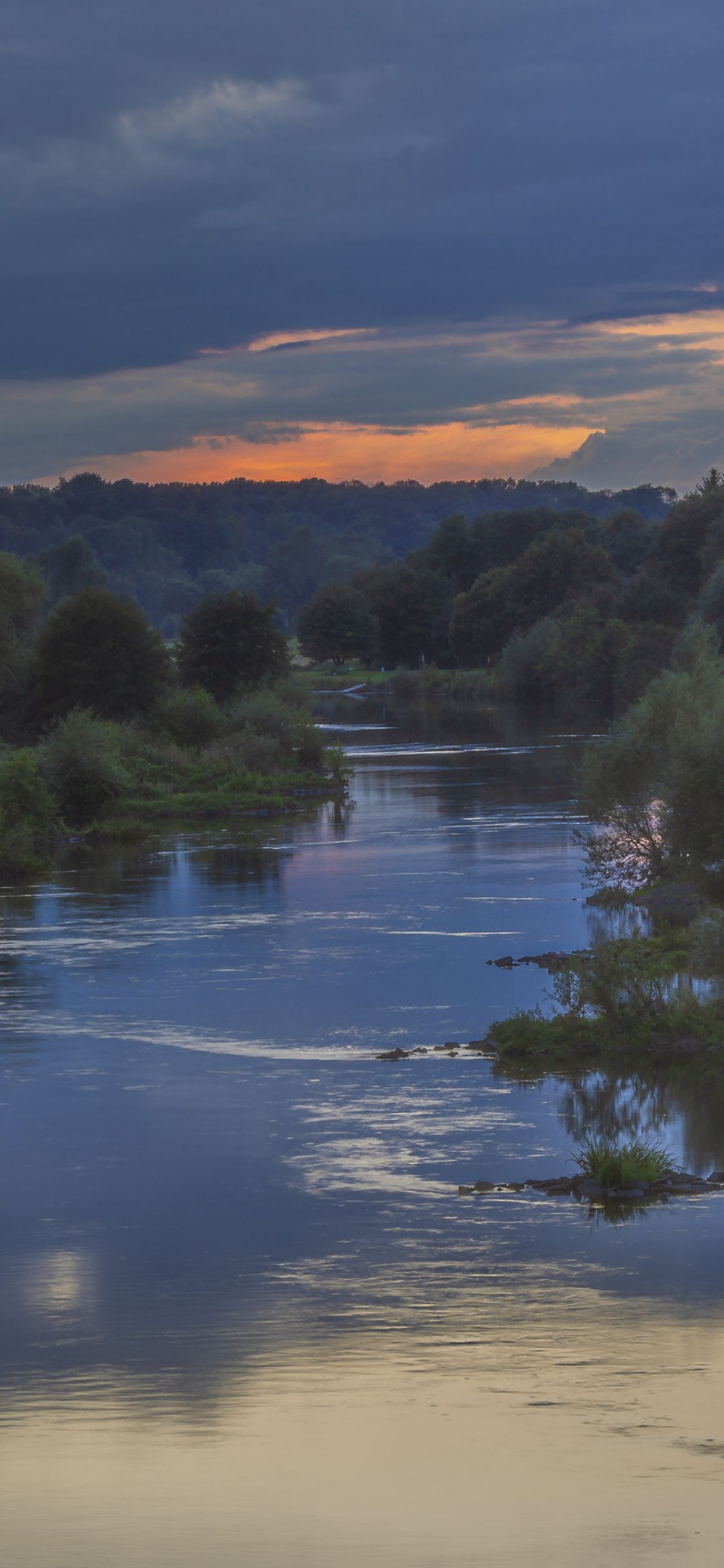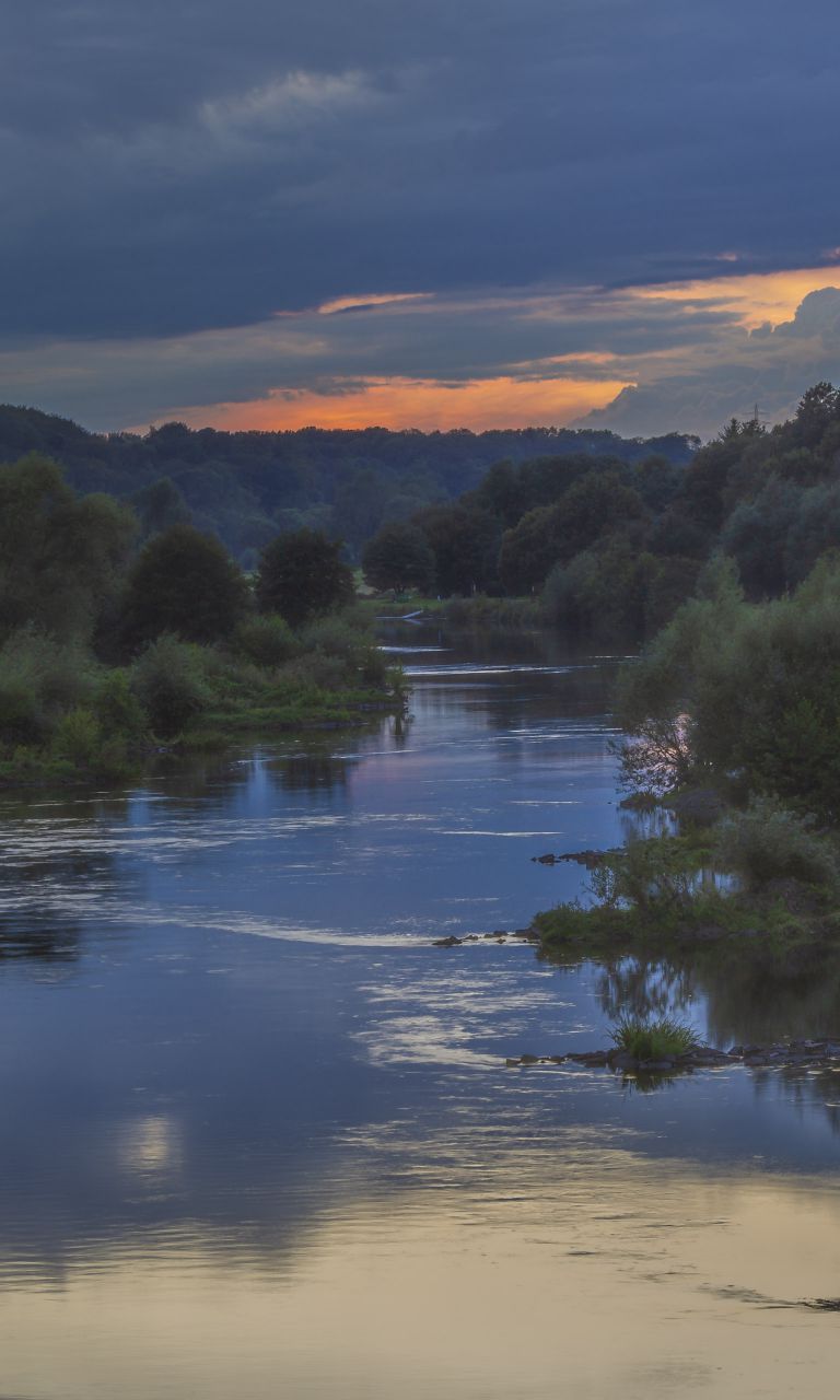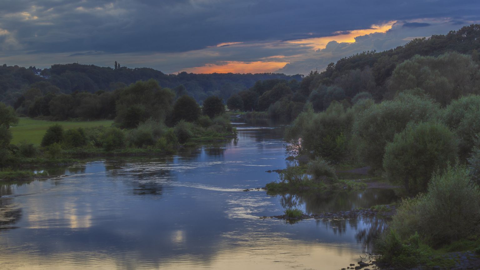Das Hintergrundbild zeigt die Abendstimmung an der Ruhr an einem verregneten Sommertag. Die Aufnahme entstand kurz nach dem Sonnenuntergang in Bochum.
