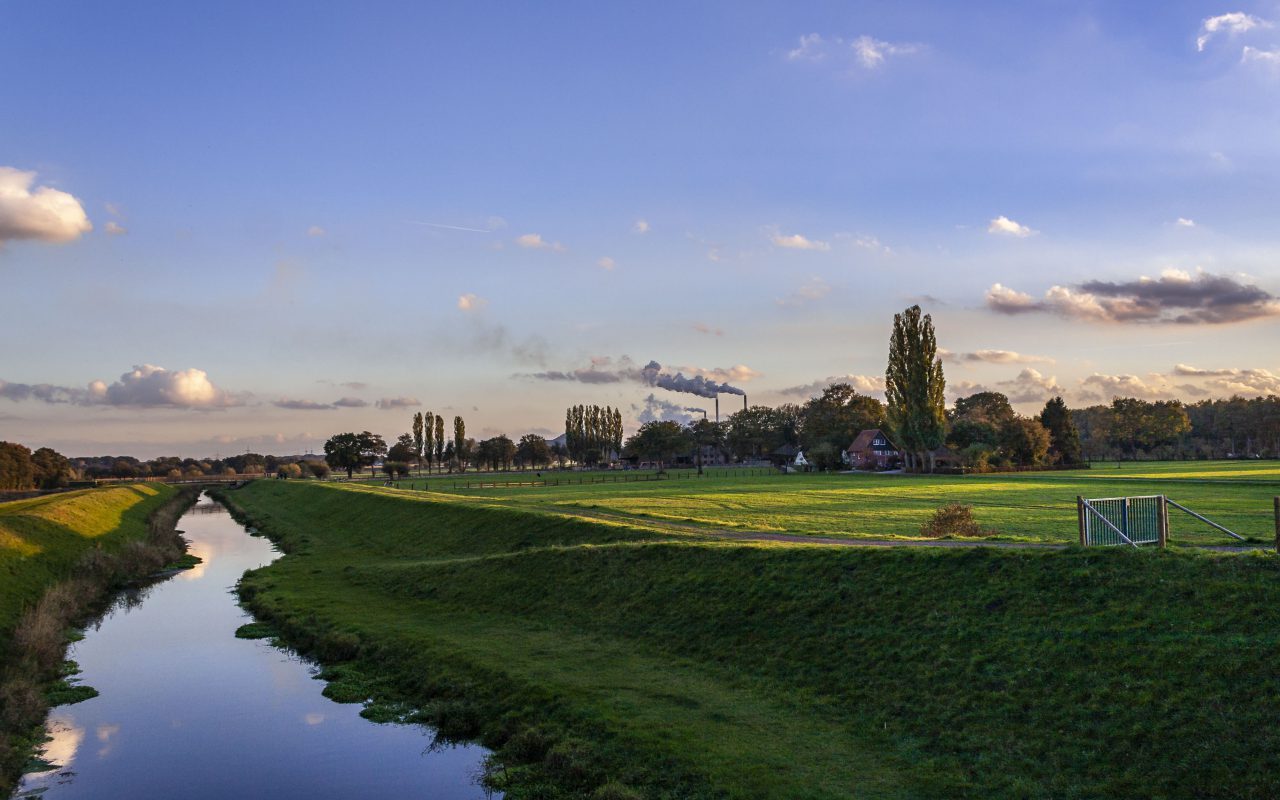 Das Hintergrundbild zeigt einen Bach und Wiesen an einem schönen, ruhigen Herbsttag. Der Rapphofs Mühlenbach fließt hier durch Dorsten, kurz bevor er in die Lippe mündet.