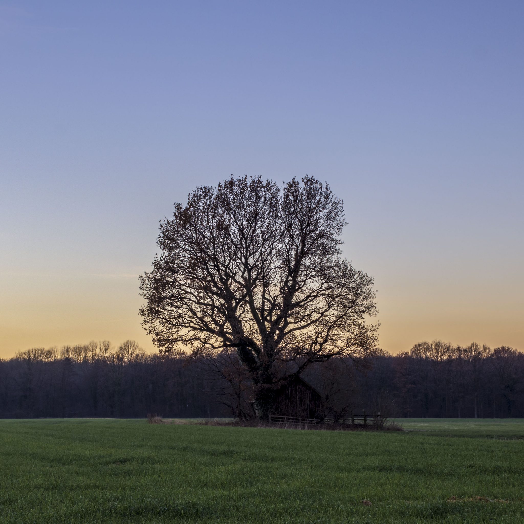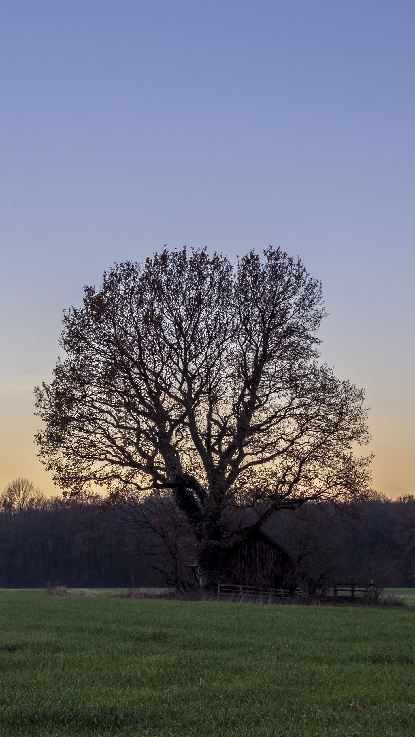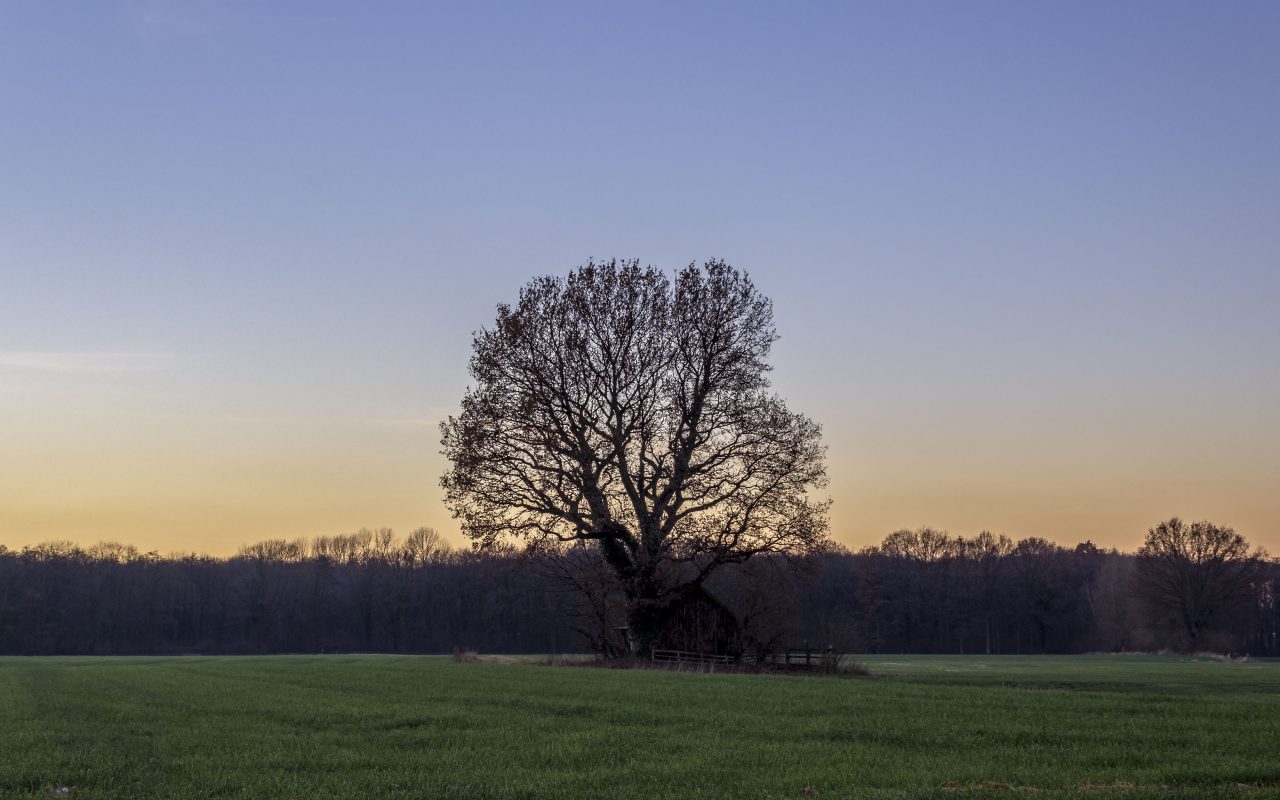 Wunderbare Abendstimmung im Ruhrgebiet. Das Foto für unser Hintergrundbild entstand in Gladbeck, wo dieser beeindruckende Baum inmitten von Wiesen und Feldern steht.