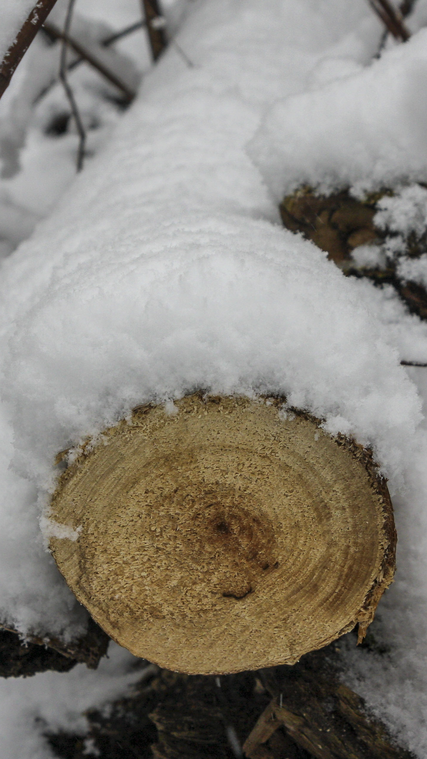 Impressionen aus dem winterlichen Wald. Ein gefällter Baum ist von einer dicken Schneeschicht überzogen. Der Baumstamm ist ein schöner Kontrast zum weißen Schnee.