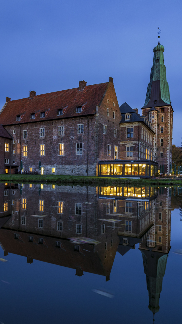 Das Schloss Raesfeld und sein Spiegelbild während der Blauen Stunde. Das Hintergrundbild entstand an einem ruhigen Herbstabend im November.