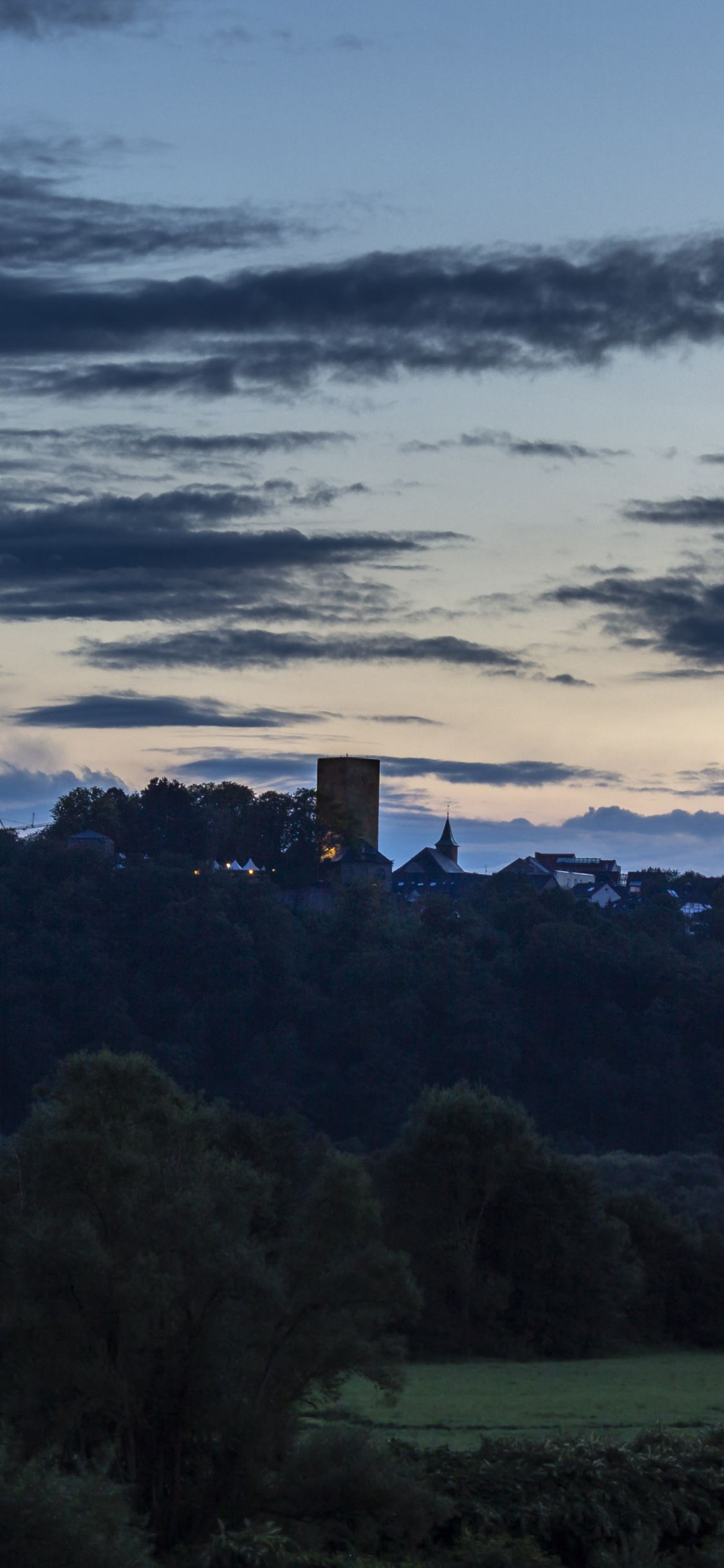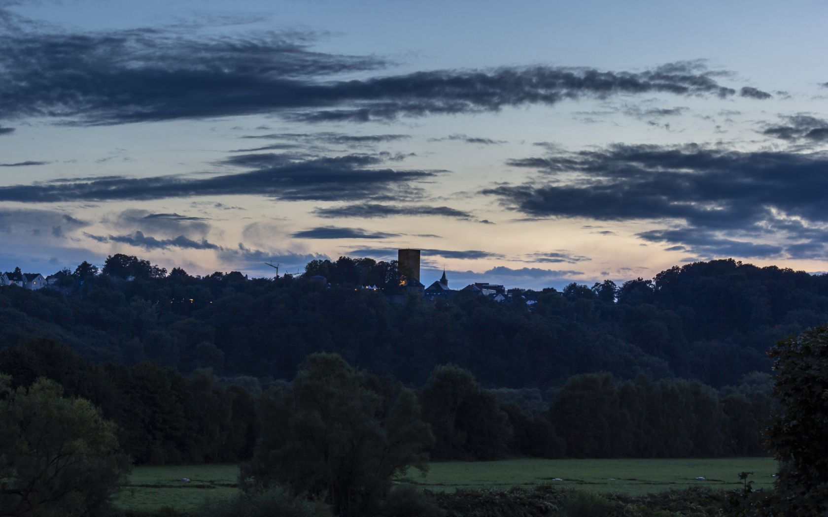 Blick zur Burg Blankenstein während er Blauen Stunde. Das Hintergrundbild entstand an einem durchwachsenen Sommerabend nach dem Sonnenuntergang.