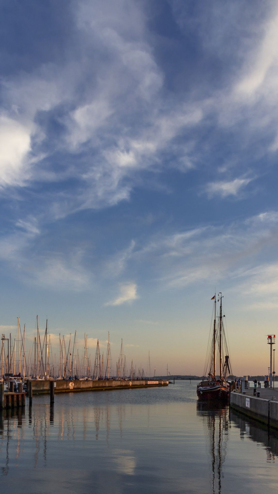 Abends im Hafen des Ostseebades Laboe. Der Blick geht aus dem Hafen in die Kieler Förde. Das Hintergrundbild entstand an einem schönen Frühlingsabend.