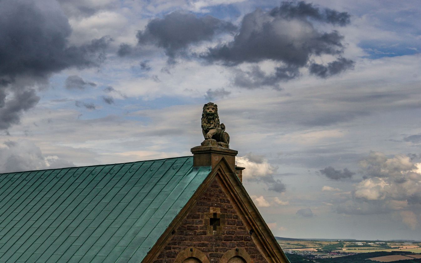 Dieses Wallpaper zeigt den Blick vom Südturm zum Palas der Wartburg. Dahinter sind die dunklen Wolken eines aufziehenden Unwetters zu erkennen.