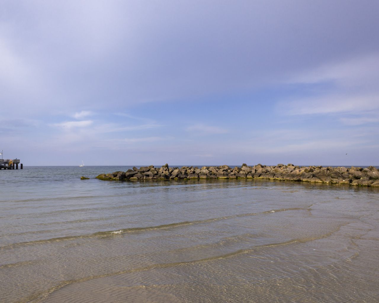 Ein schöner Frühlingstag am Schönberger Strand an der Ostsee. Beim Blick aufs ruhige Meer ist links ein Teil der Seebrücke und rechts eine Buhne zu sehen.