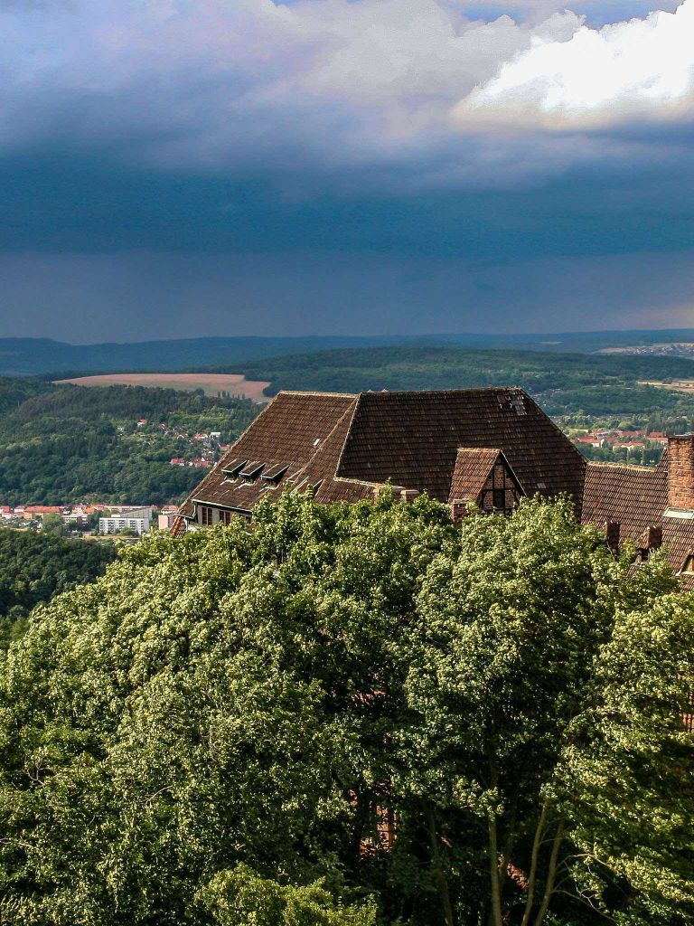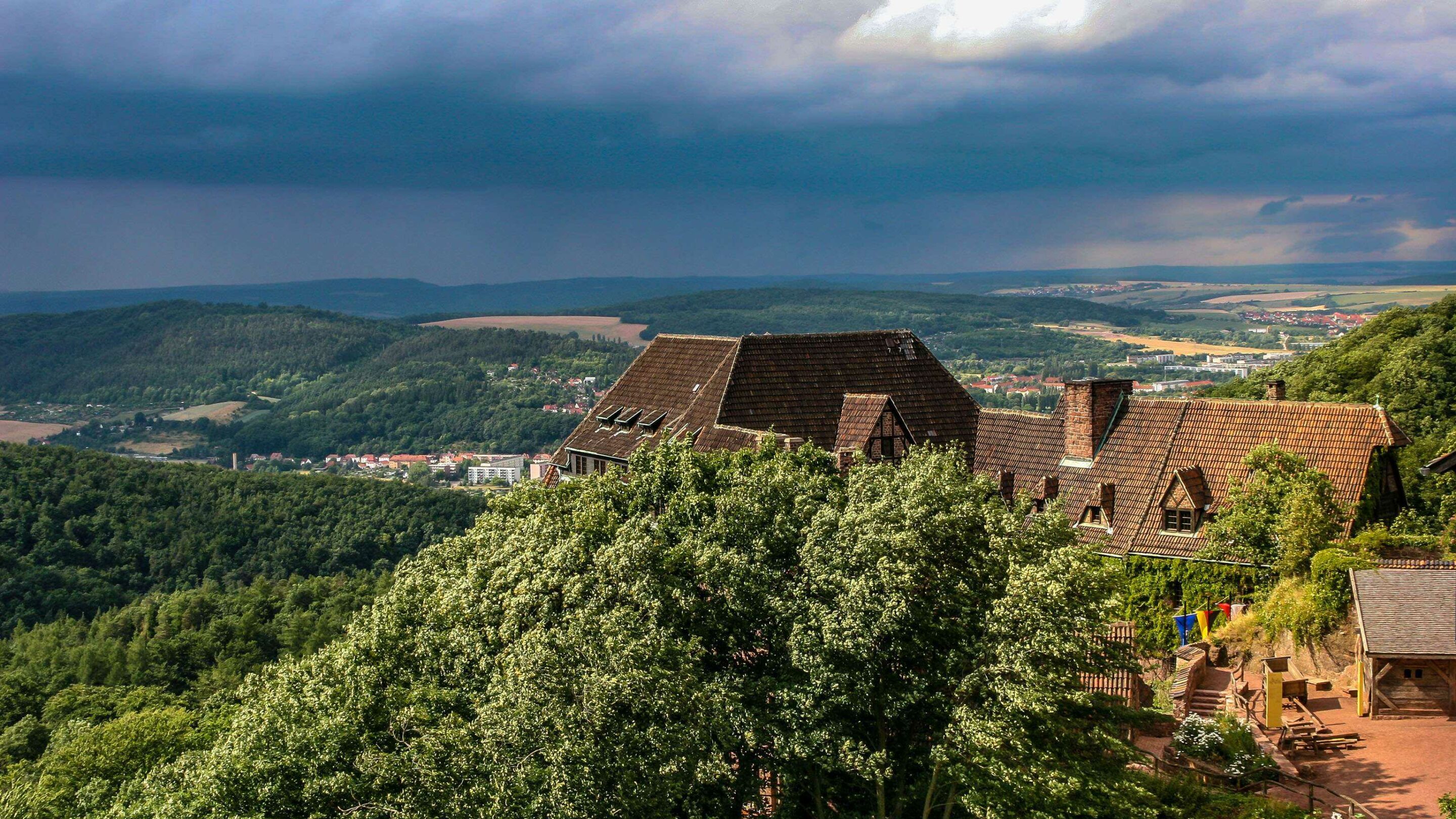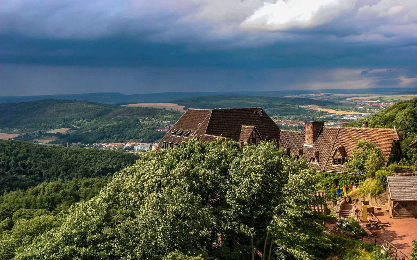 Das Wallpaper zeigt, wie sich im Nordwesten der Wartburg ein Gewitter zusammenbraut. Während an der Dirnitz noch die Sonne scheint, sind dahinter bereits dunkle Regenwolken zu sehen. Wenig später setzte dann auch über der Burg ein heftiger Regen ein.