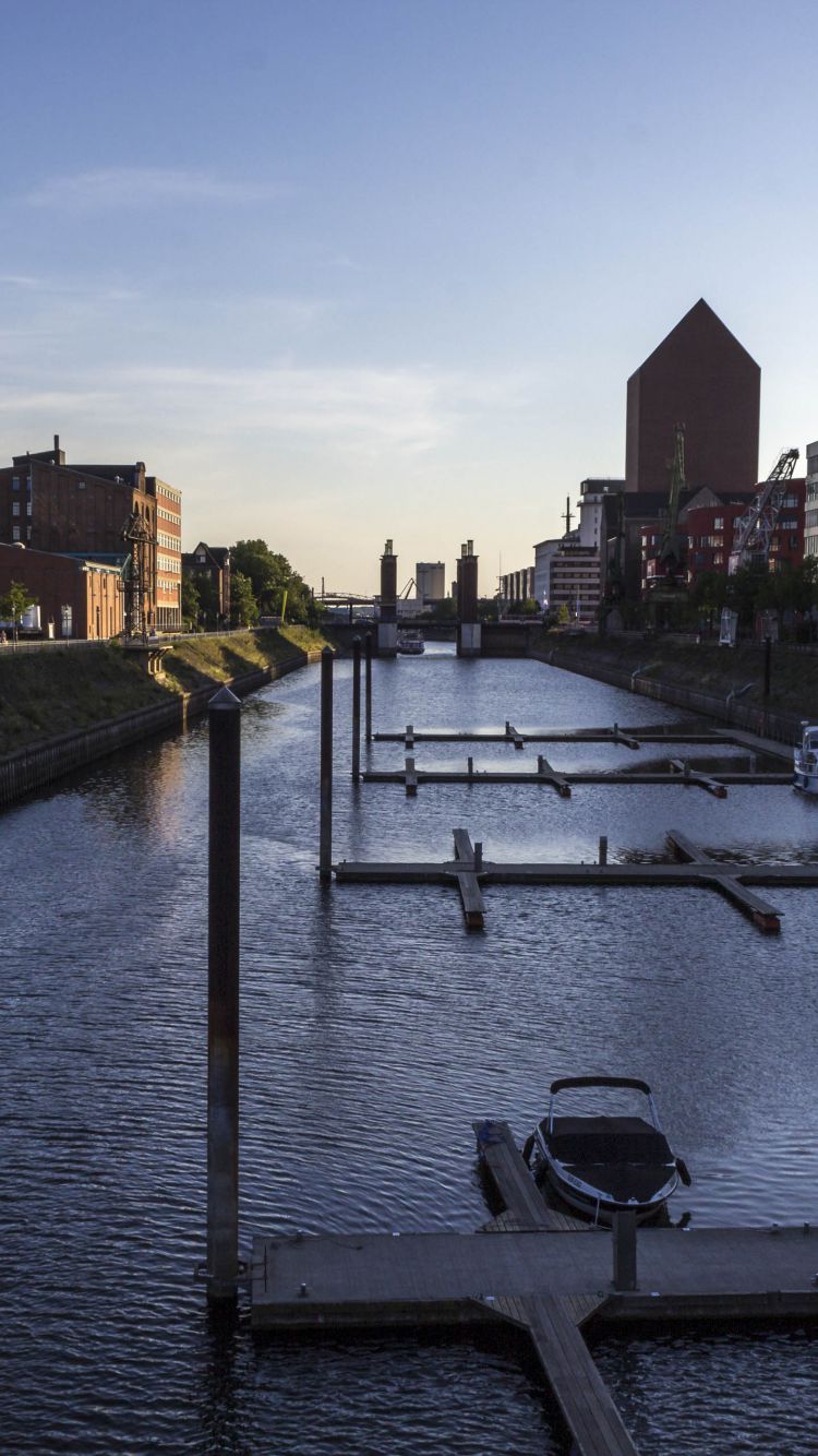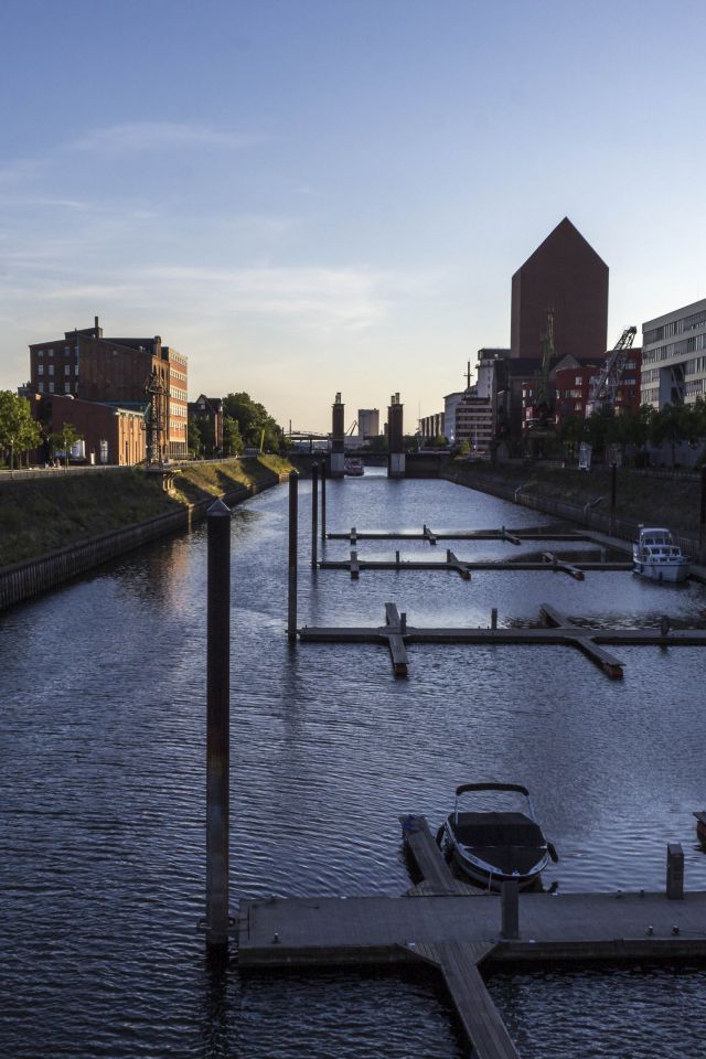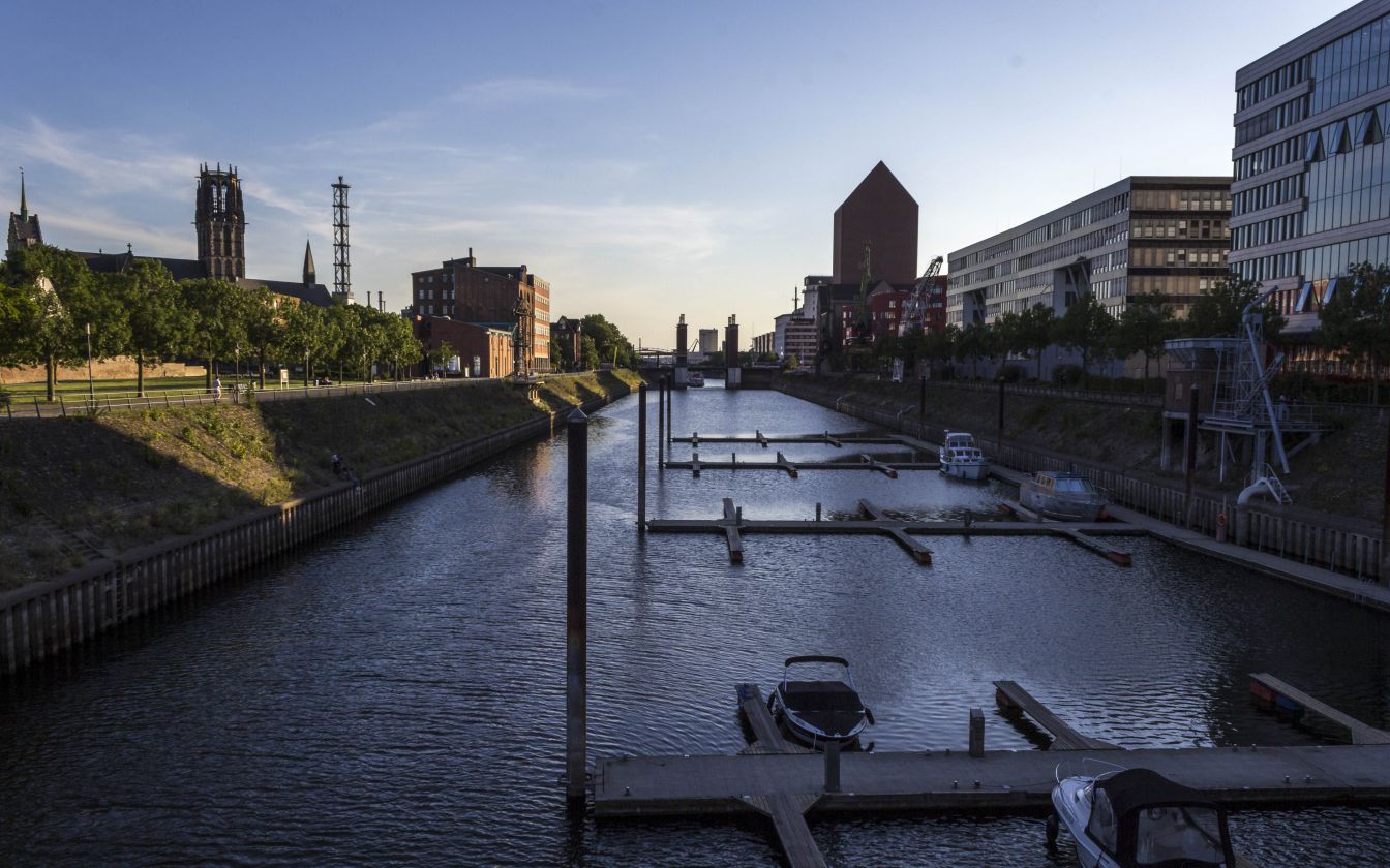 Dieses Hintergrundbild zeigt einen Teil der Marina im Duisburger Innenhafen in der Abenddämmerung. Rechts im Hintergrund sehen Sie den Hohlspeicher, in dem sich heute das Landesarchiv NRW befindet. Auf der linken Seite der Aufnahme ist die Salvatorikirche zu erkennen. Im Hintergrund ist die Schwanentorbrücke zu sehen. Die Aufnahme entstand an einem schönen Sommerabend im Innenhafen Duisburg im Juli 2017.