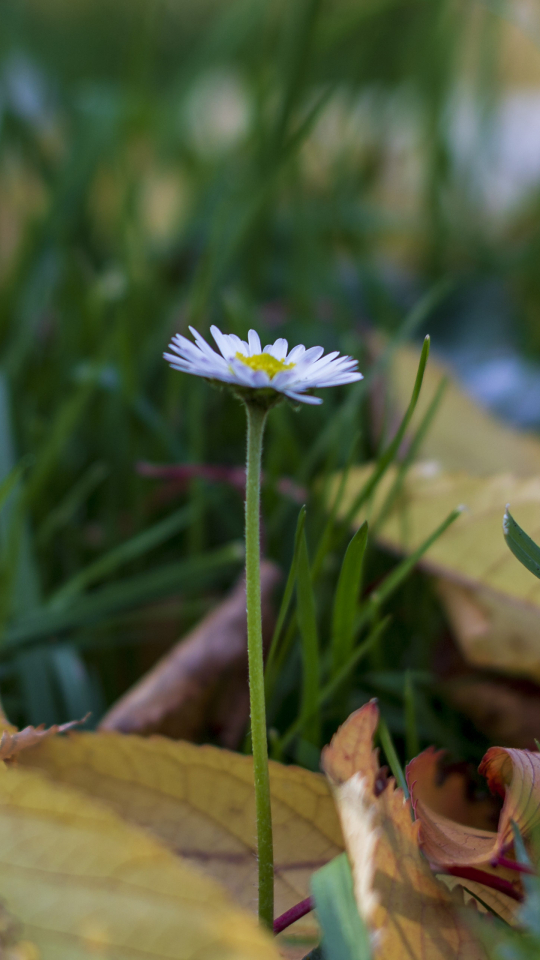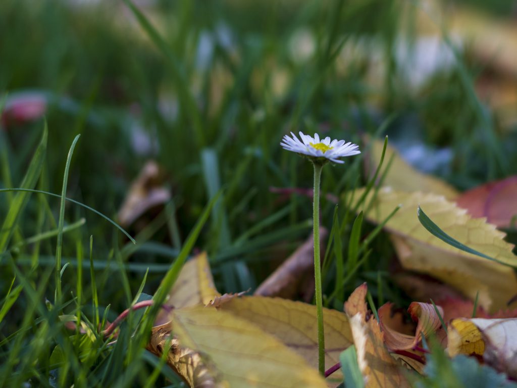 Gänseblümchen sind toll. Unser Hintergrundbild zeigt eins davon ganz einsam zwischen buntem Herbstlaub. Die Nahaufnahme entstand an einem schönen Oktobertag.