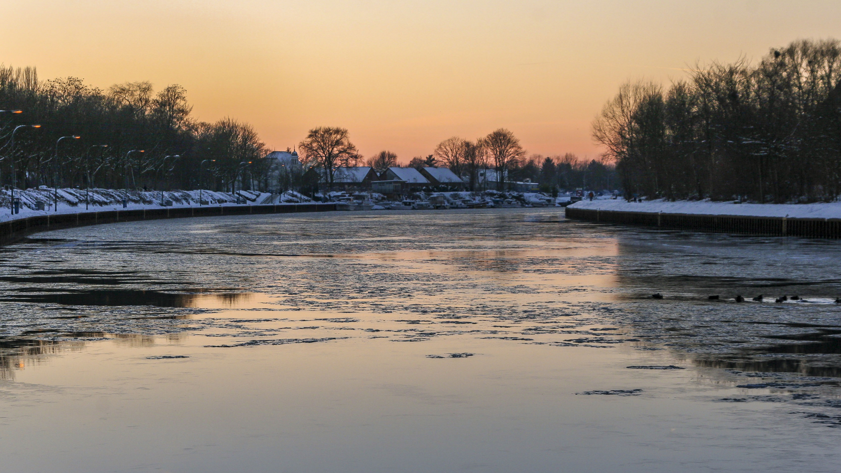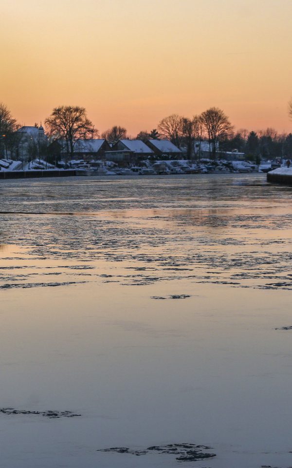 Unser Hintergrundbild zeigt Eis auf dem Wesel-Datteln-Kanal an einem bitterkalten Winterabend. Abgerundet wird das Ganze durch einen wunderschönen Abendhimmel.