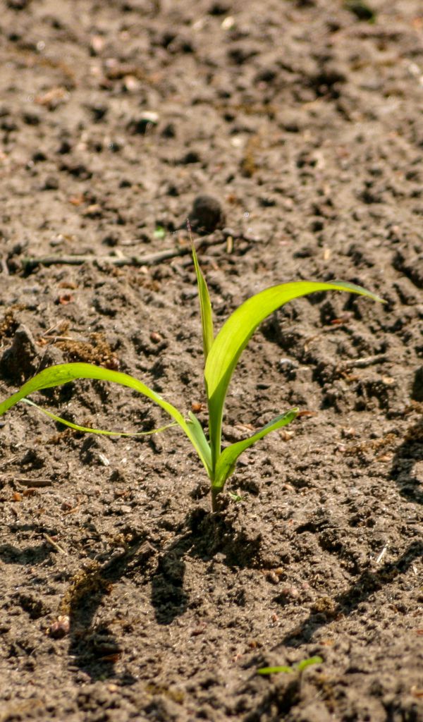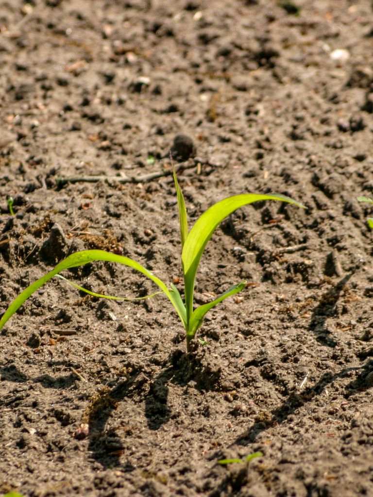 Endlich sind erste Triebe zu sehen. Ein sicheres Zeichen dafür, dass der Frühling endlich da ist. Auf dem Hintergrundbild sind es junge Maispflanzen, die die Frühlingssonne genießen.