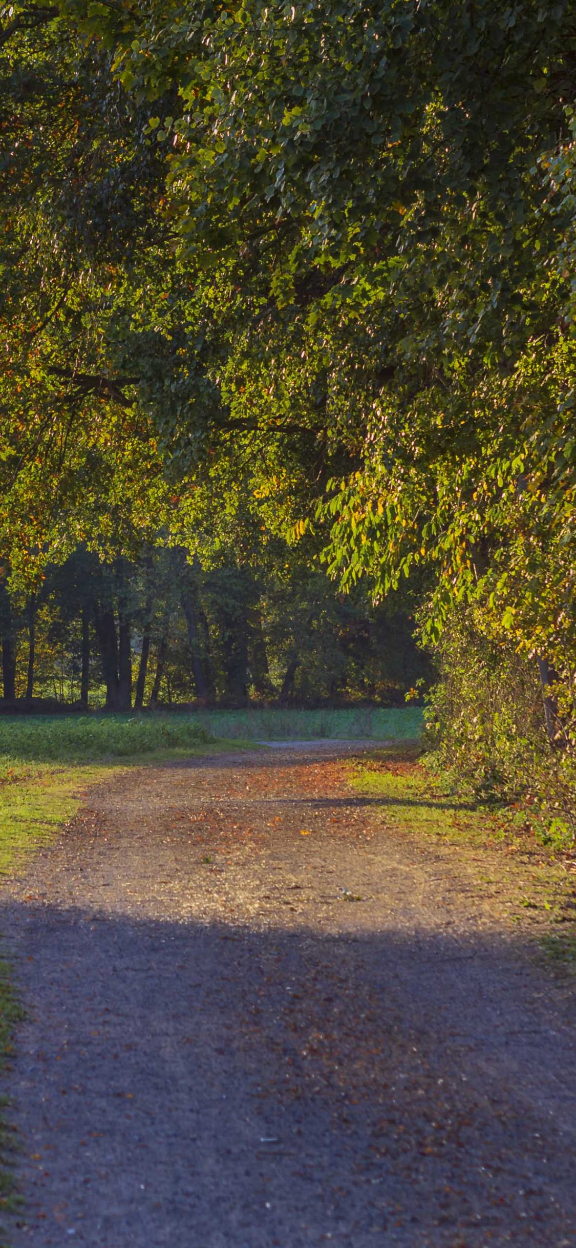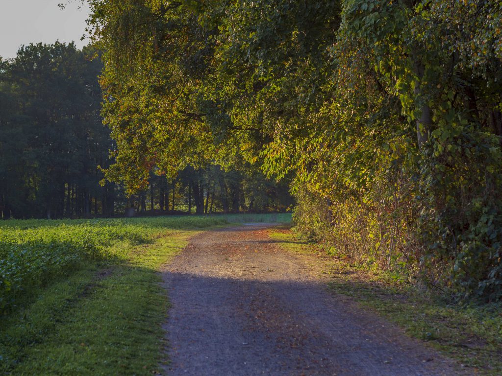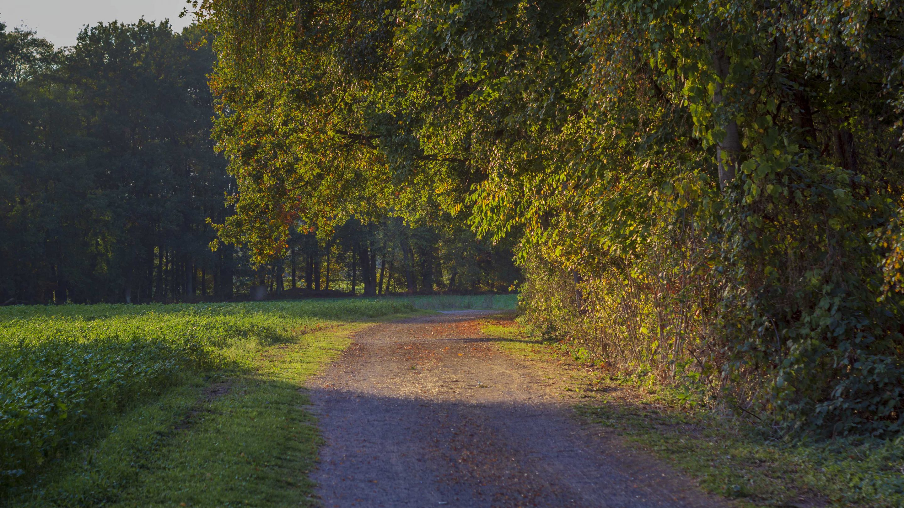 Schöne Herbststimmung. Das Hintergrundbild zeigt einen Feldweg der an einem Wald vorbei führt. Dazu kommt ein wunderbares Abendlicht.