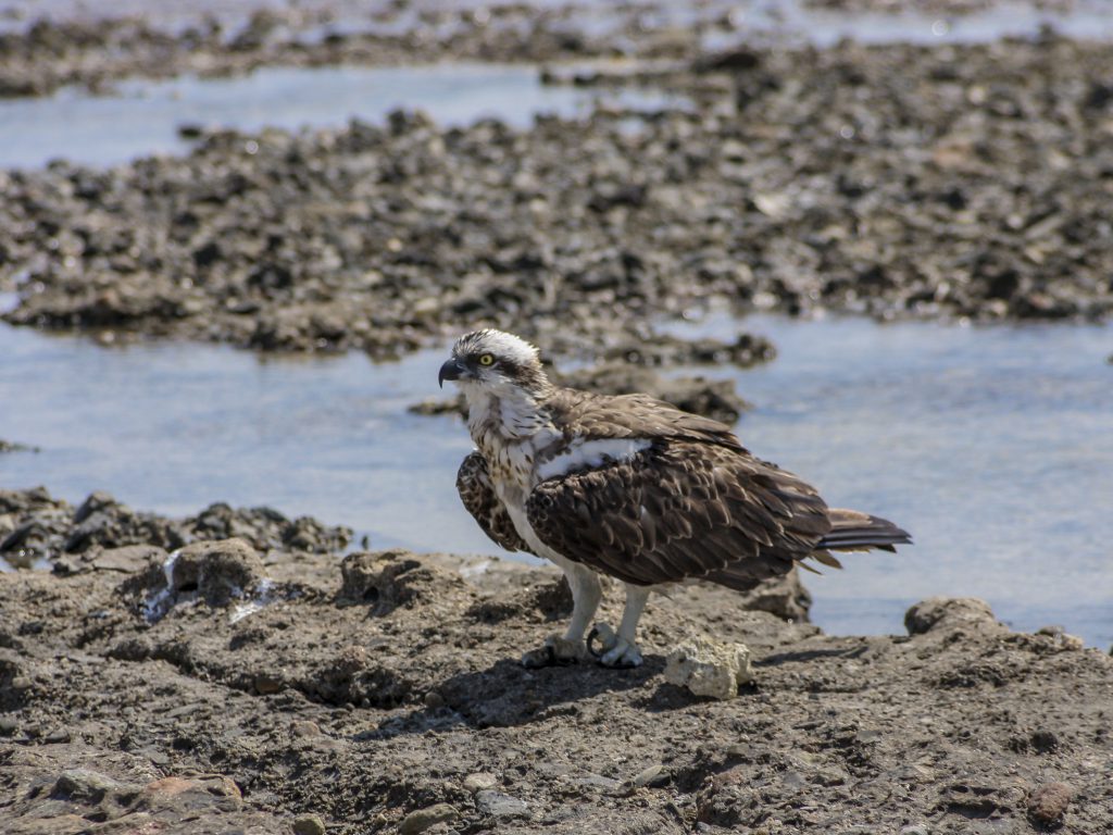 Ein Fischadler ruht sich am Felsstrand des Roten Meeres aus. Die Aufnahme des wunderschönen Vogels entstand in Marsa Alam in Ägypten. Das Hintergrundbild ist vor allem für Desktop-PCs und Tablets geeignet, da der Adler auf schmalen Smartphone Displays teilweise stark beschnitten ist.