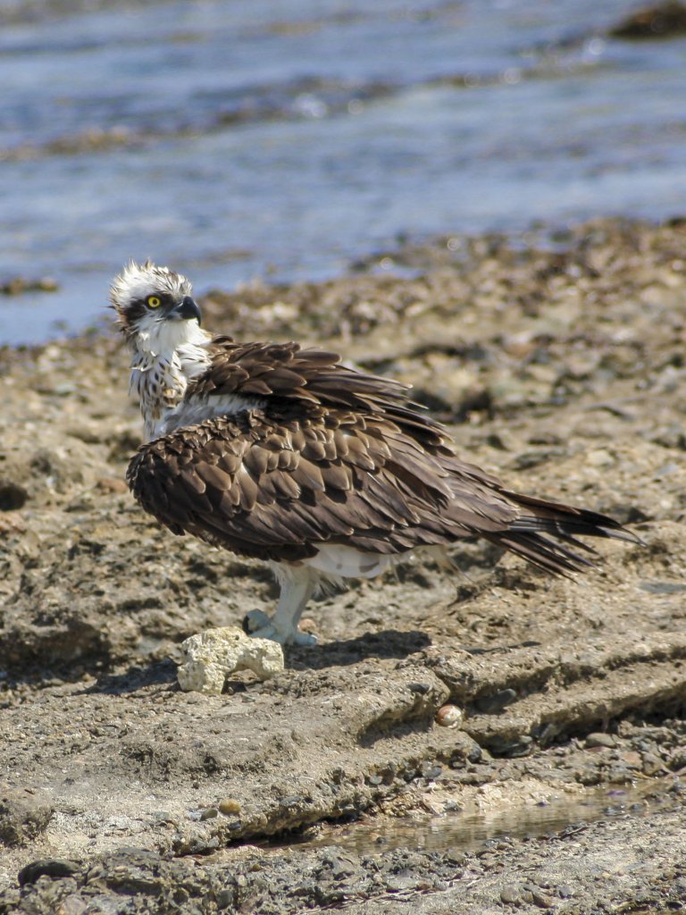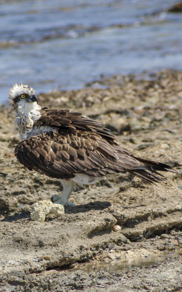 Ein Fischadler trocknet sein Gefieder am Strand des Roten Meeres. Die Aufnahme dieses wunderschönen Tieres entstand in Marsa Alam in Ägypten. Das Hintergrundbild ist vor allem für Desktop-PCs und Tablets geeignet, da der Adler auf schmalen Smartphone Displays teilweise stark beschnitten ist.