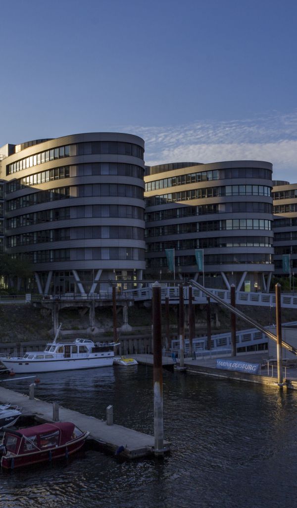 Die markanten „Five Boats“ im Abendlicht. Das Gebäudeensemble ist eines der auffälligsten neuen Bauwerke im Duisburger Innenhafen. Das Hintergrundbild zeigt zeigt die 5 Gebäude im Abendlicht. Davor ist ein Teil der Marina zu sehen. Die Aufnahme entstand an einem schönen Juliabend im Sommer 2017.
