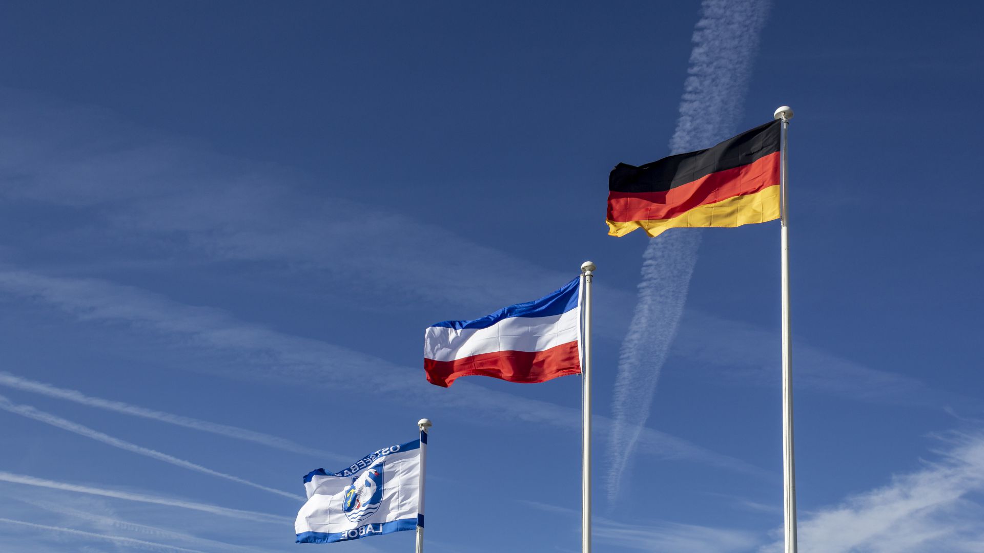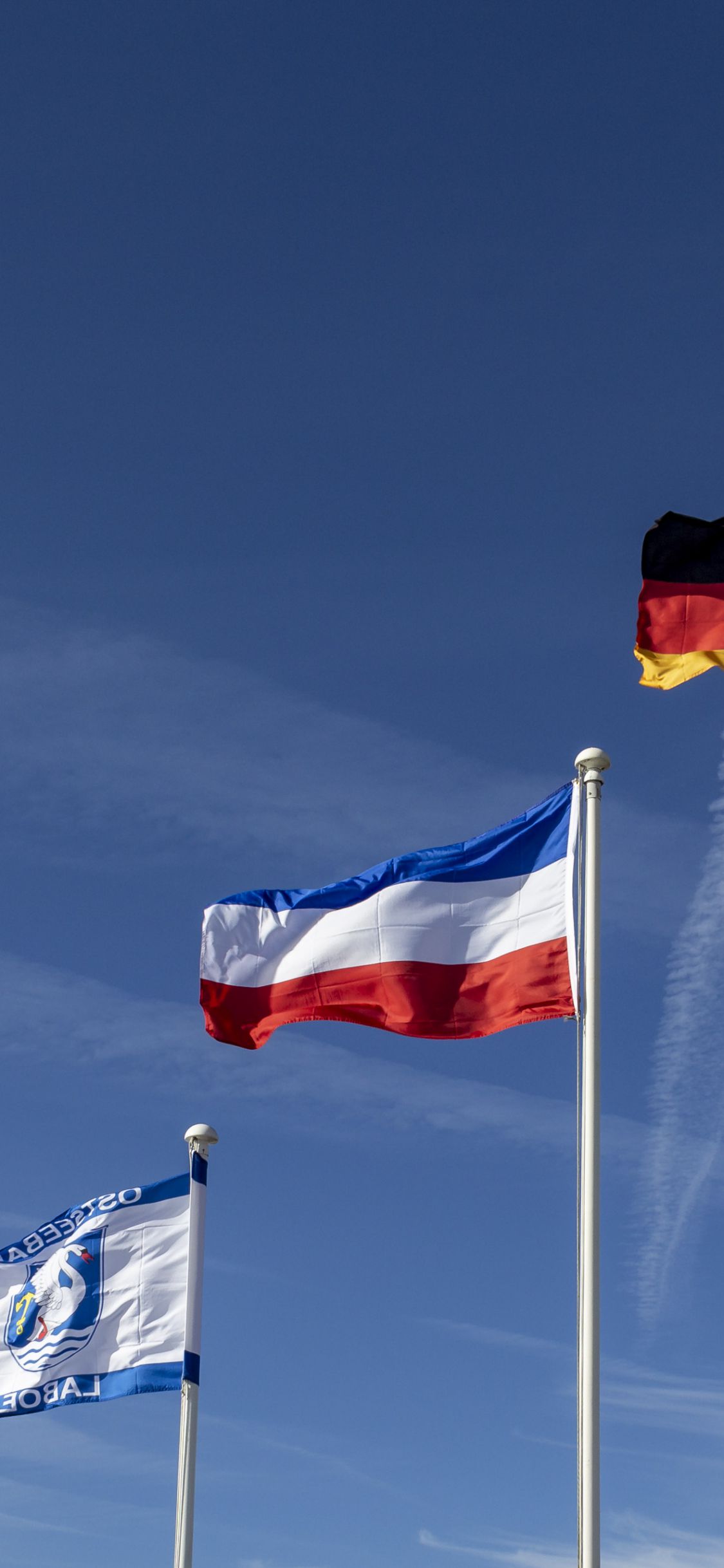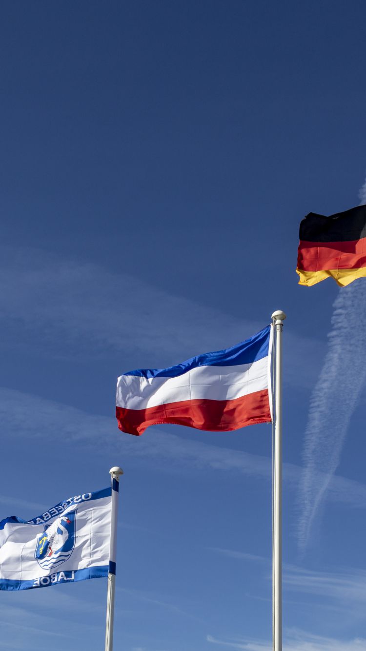 Die Flaggen von Deutschland, Schleswig Holstein und Laboe flattern vor einem herrlich blauen Himmel. Das Hintergrundbild entstand an der Ostsee in Laboe.