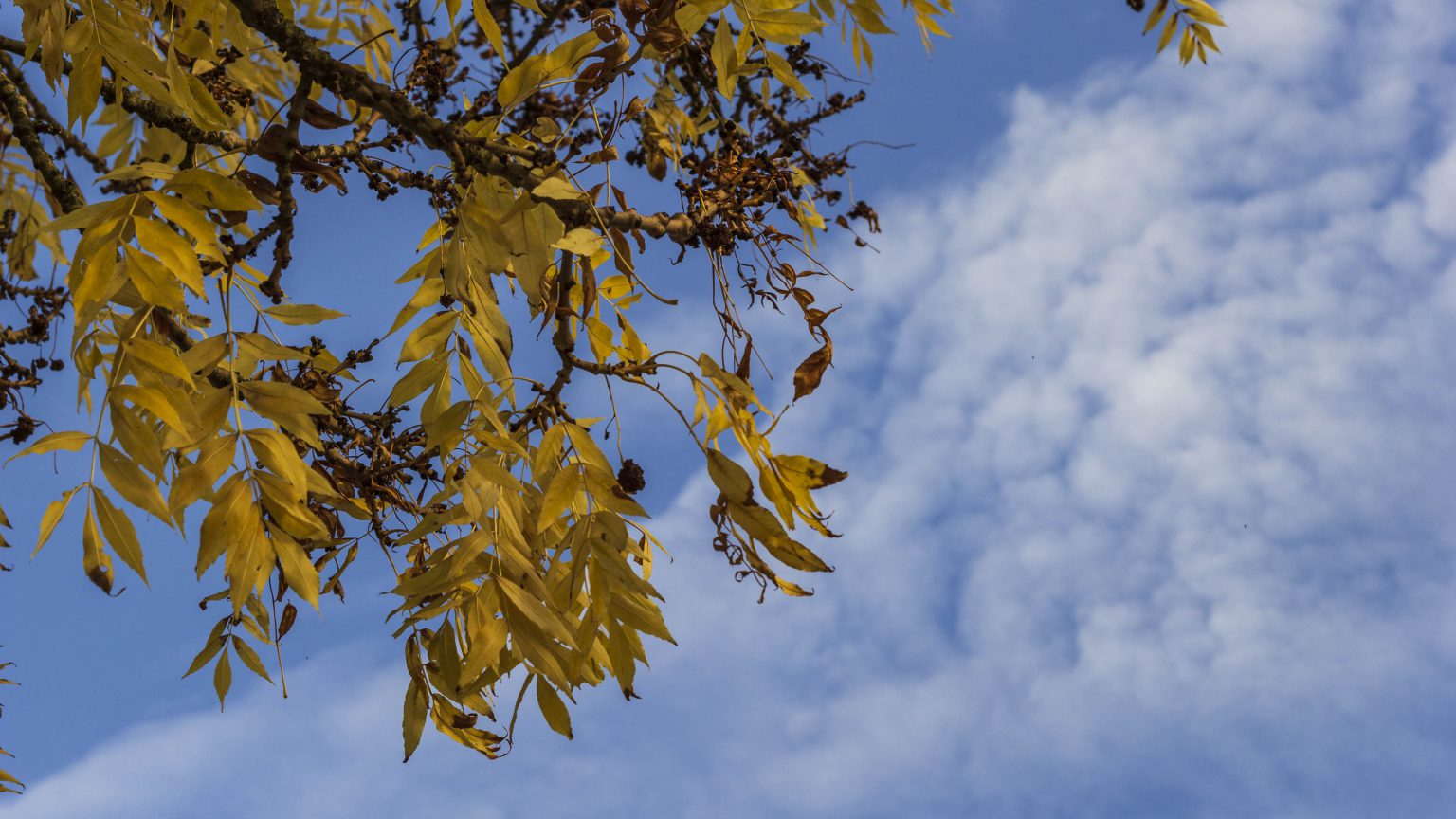 Auf dem Hintergrundbild sind gelbe Blätter vor einem schönen blauen Himmel zu sehen. Die Blätter gehören zu einer Schwarznuss und bieten einen schönen Kontrast zum Blau des Himmels.
