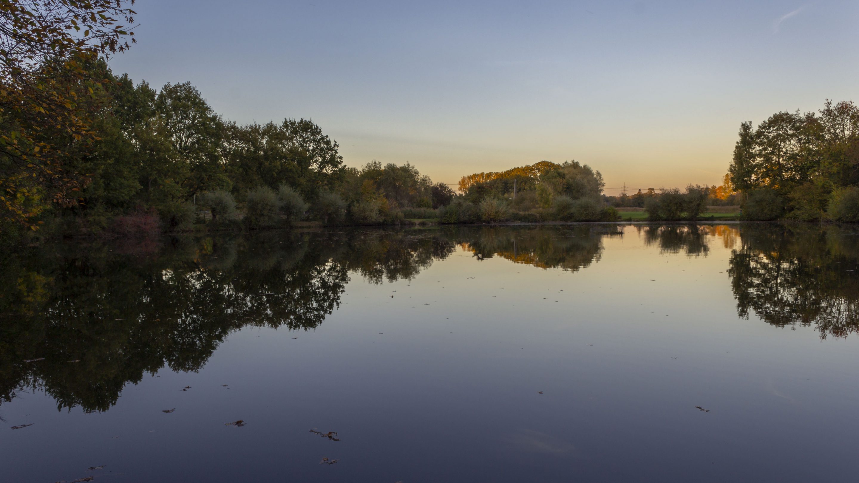 Ein Herbstabend am Mühlteich der Tüshaus Mühle in Dorsten. Im ruhigen Wasser spiegeln sich der Himmel und die Bäume des Ufers. Magisch!