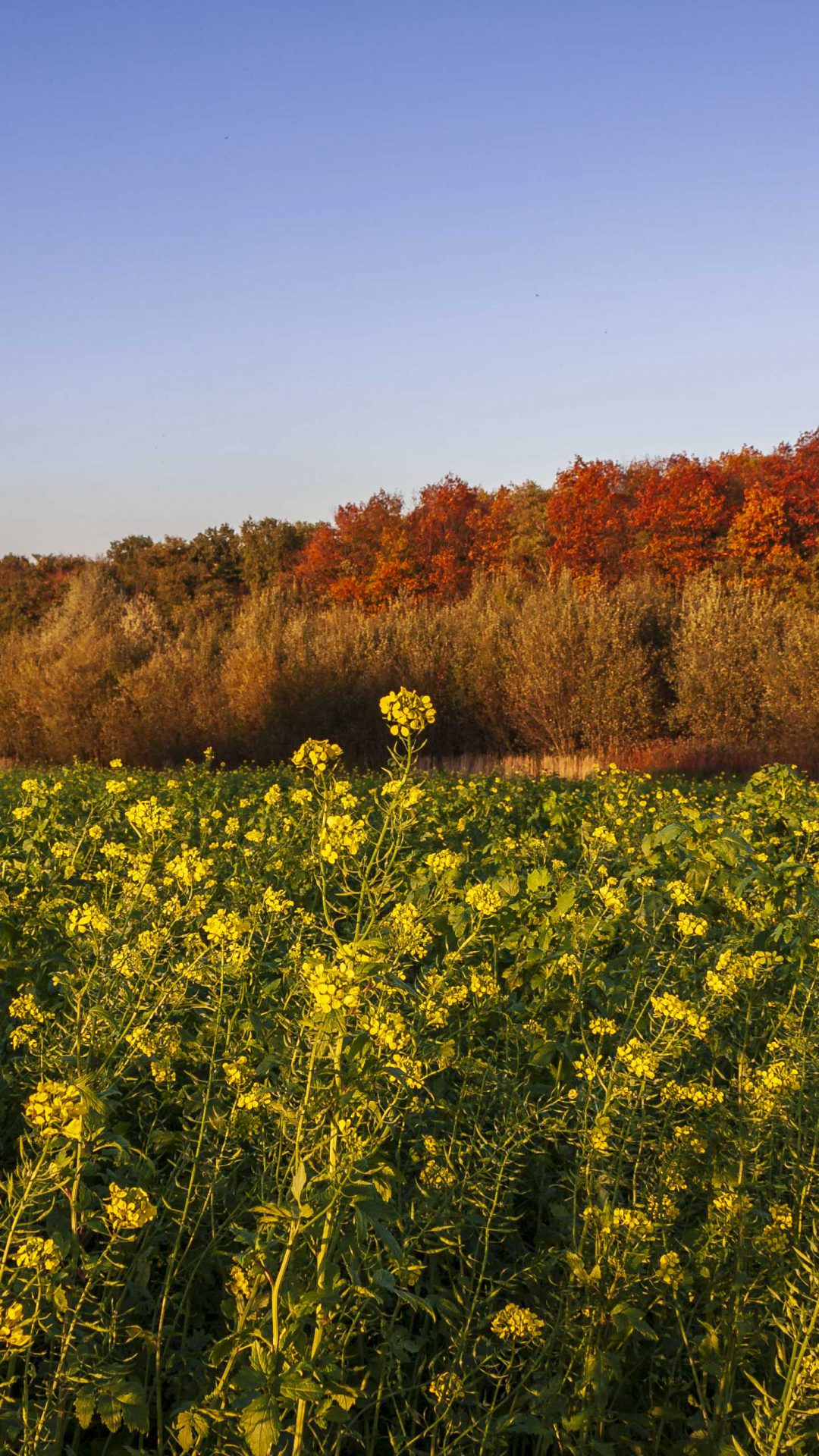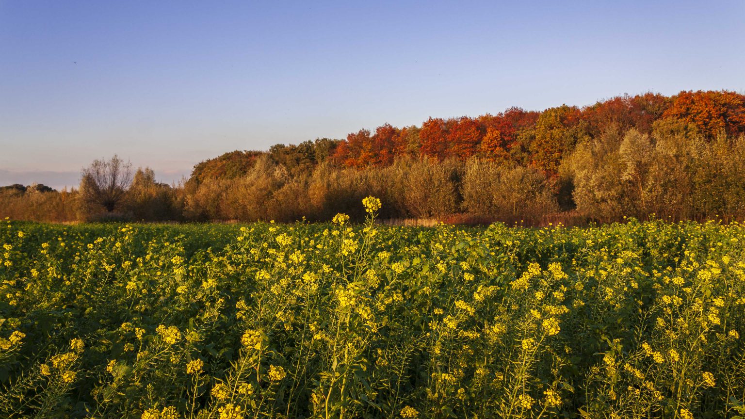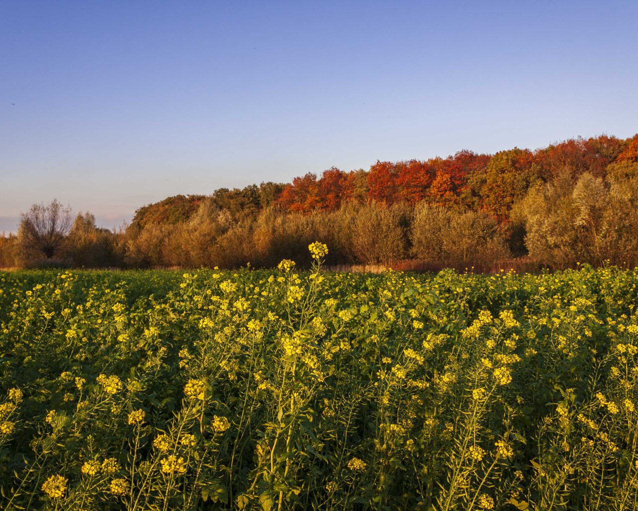 Unser Hintergrundbild zeigt ein typisches Farbenspiel aus dem Herbst. Rapsfeld in gelb und grün, Wald in Rot- und Brauntönen und dahinter ein schöner blauer Himmel.