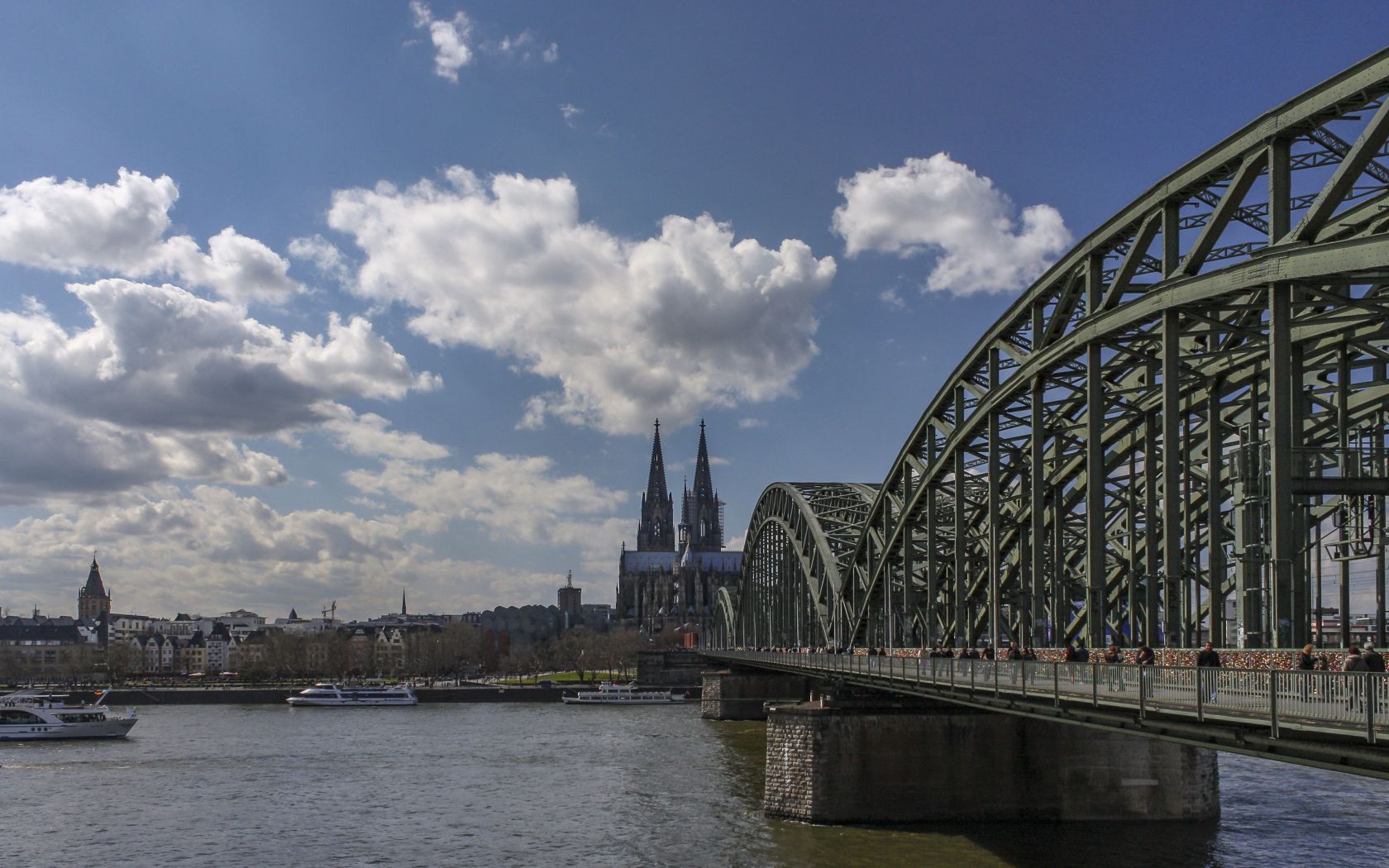 Das Hintergrundbild zeigt den Blick vom Ostufer des Rheins, die Hohenzollernbrücke entlang zum Kölner Dom.