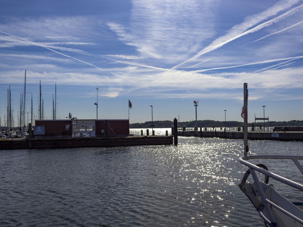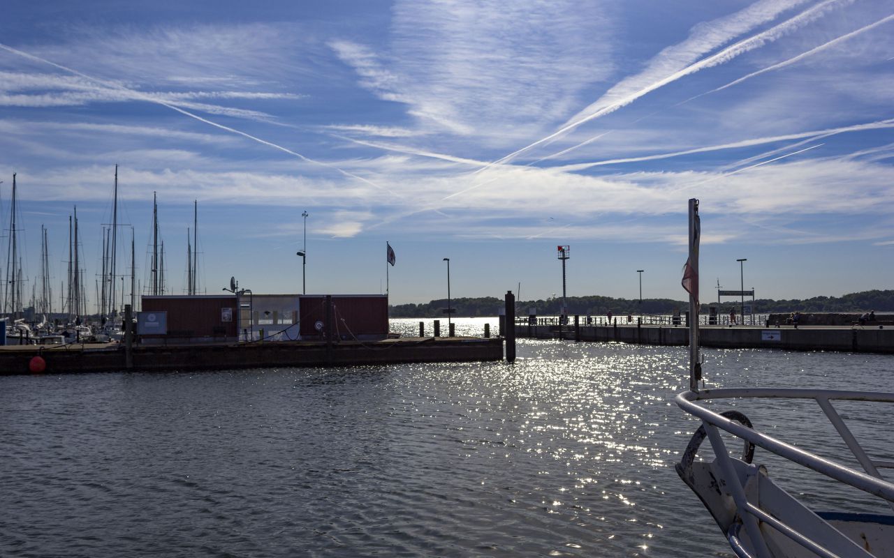 Das Hintergrundbild zeigt den Blick in den Hafen von Laboe. Die Aufnahme entstand an einem schönen Frühlingstag von der anderen Seite des Hafens.