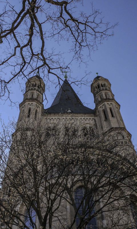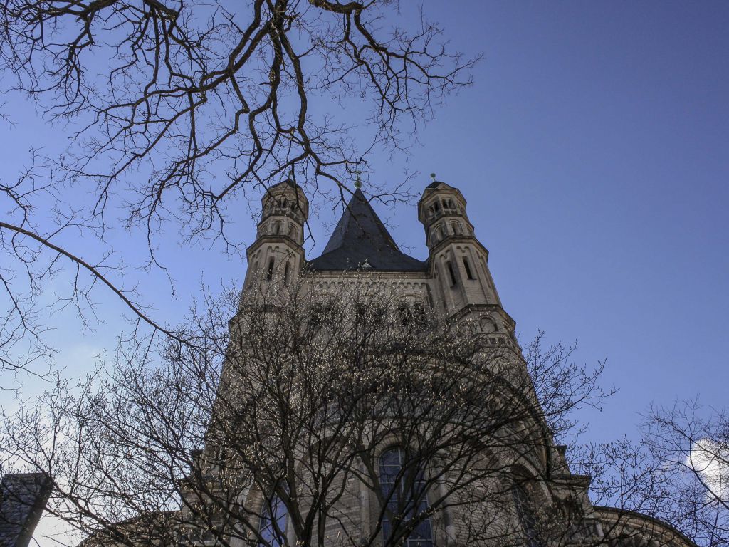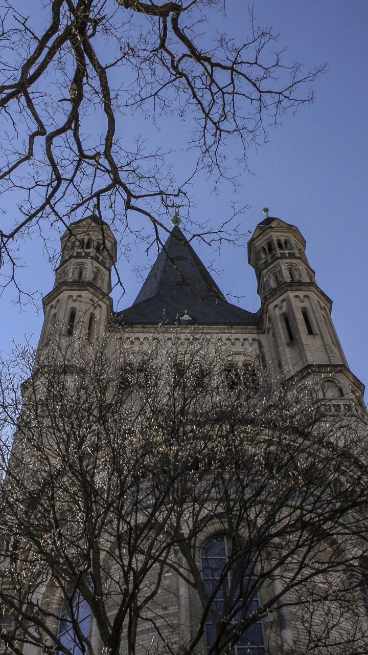 Blick hoch zu den Türmen von Groß Sankt Martin. Die Aufnahme entstand im Frühjahr, auf einer kleiner Tour durch Köln; vom Fischmarkt aus.