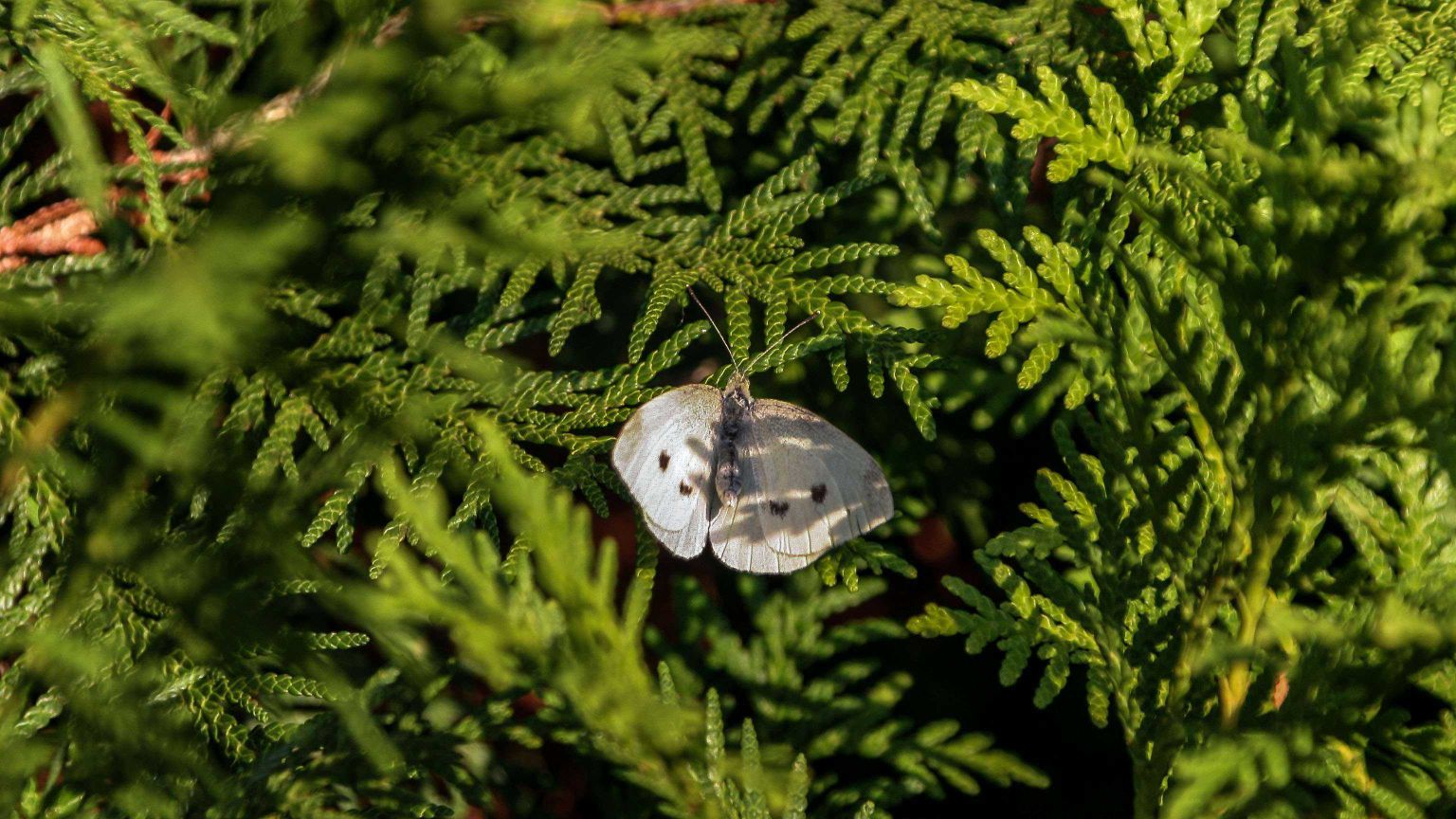 Dieses Wallpaper zeigt einen kleinen Kohlweißling, der auf den Zweiten Tuya ausruht. Offensichtlich gefällt es ihm im dichten Grün der Pflanze, denn er hat sich bereitwillig für dieses Hintergrundbild ablichten lassen.