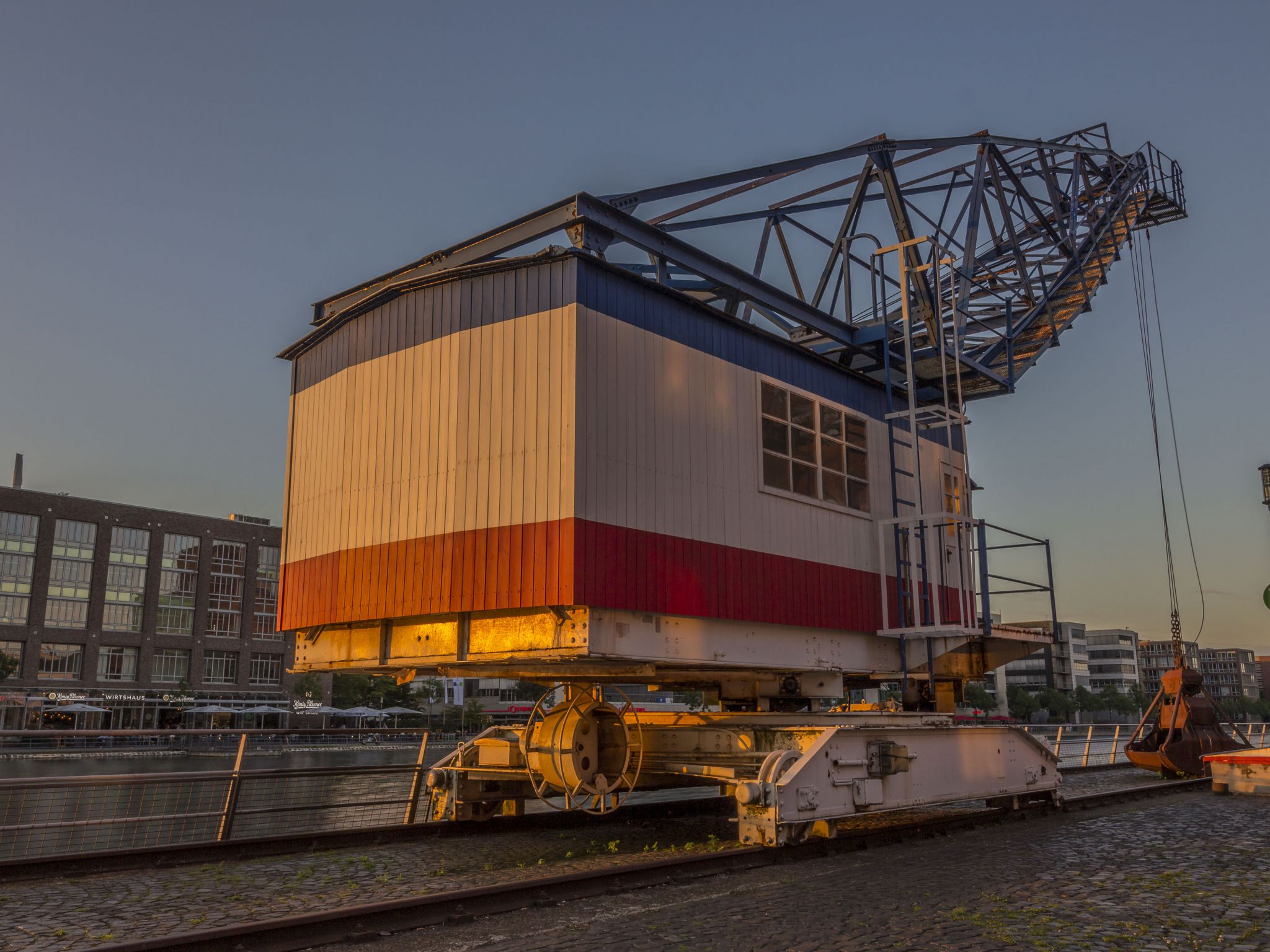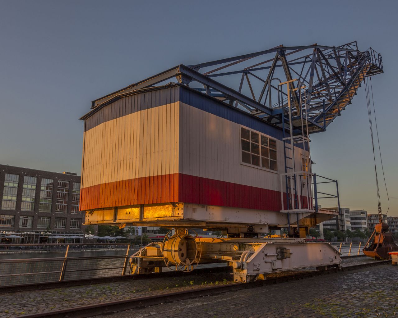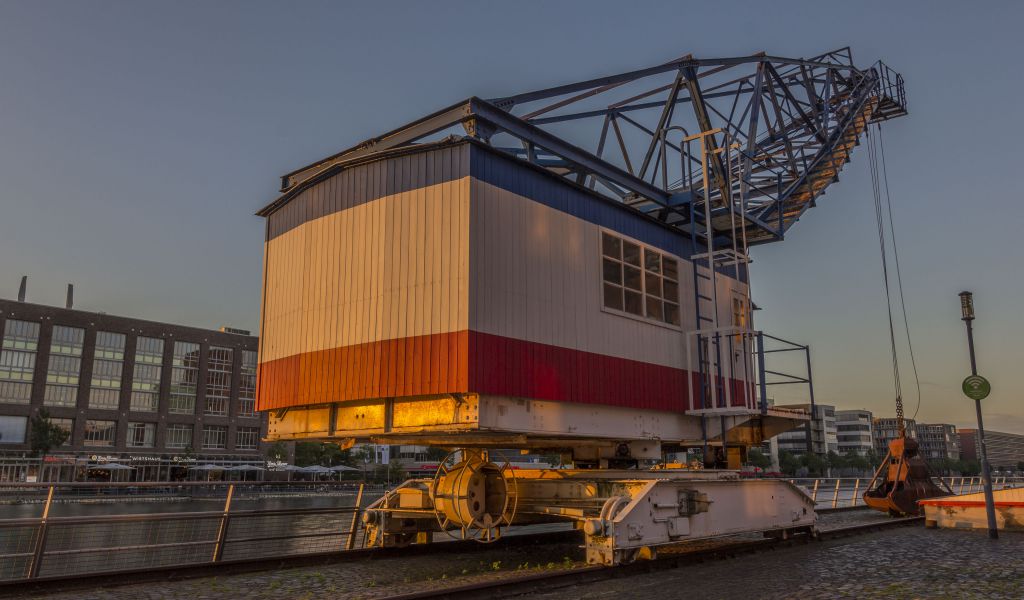 Auf dem Hintergrundbild ist der großartige Kran zu sehen, der im Duisburger Innenhafen vor dem Hafenforum steht. Die untergehende Sonne verleiht dem Wallpaper einen ganz besonderen Touch. Die Aufnahme entstand an einem schönen Sommerabend 2017 im Duisburger Innenhafen.