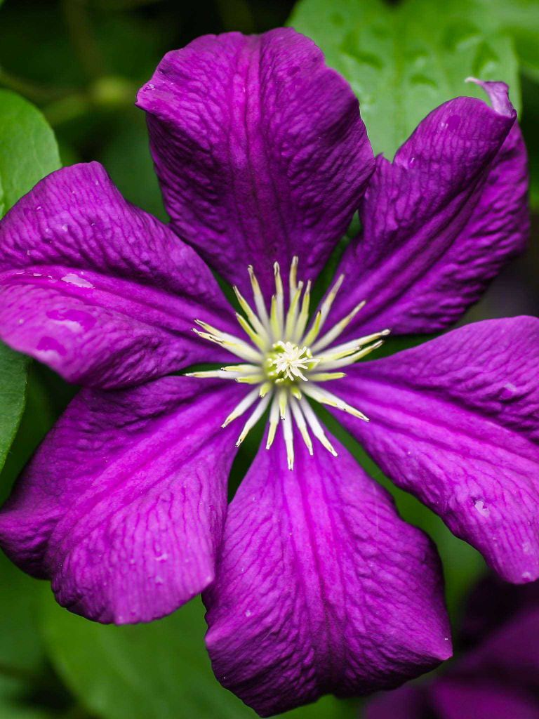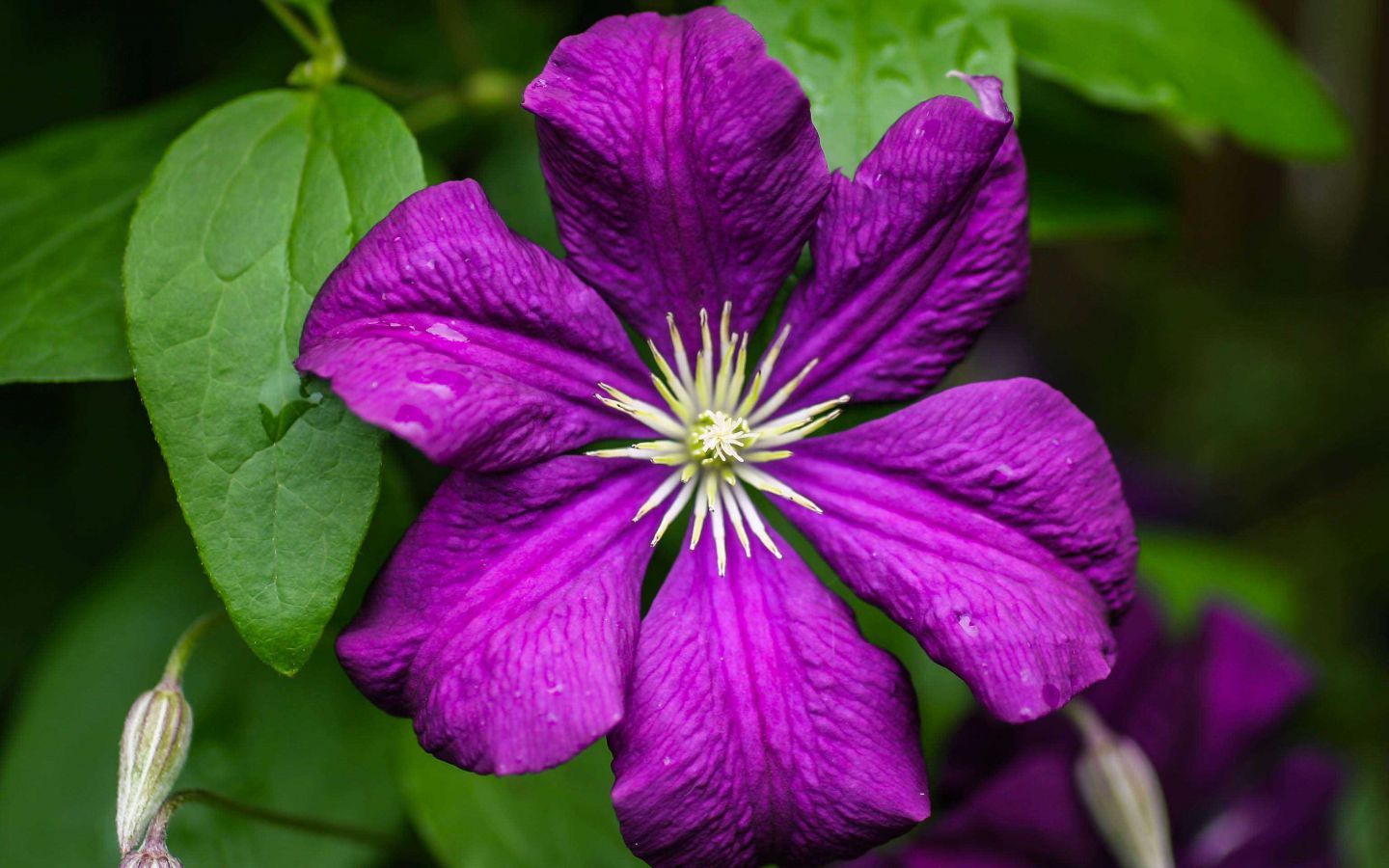 Das Wallpaper zeigt eine perfekte lila Clematis Blüte nach einem Frühlingsregen.