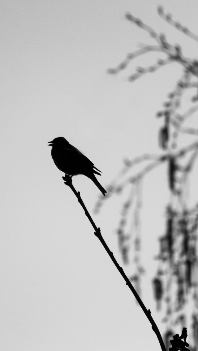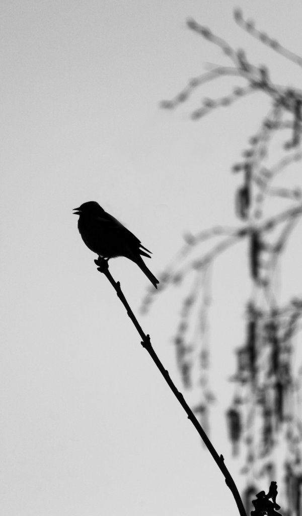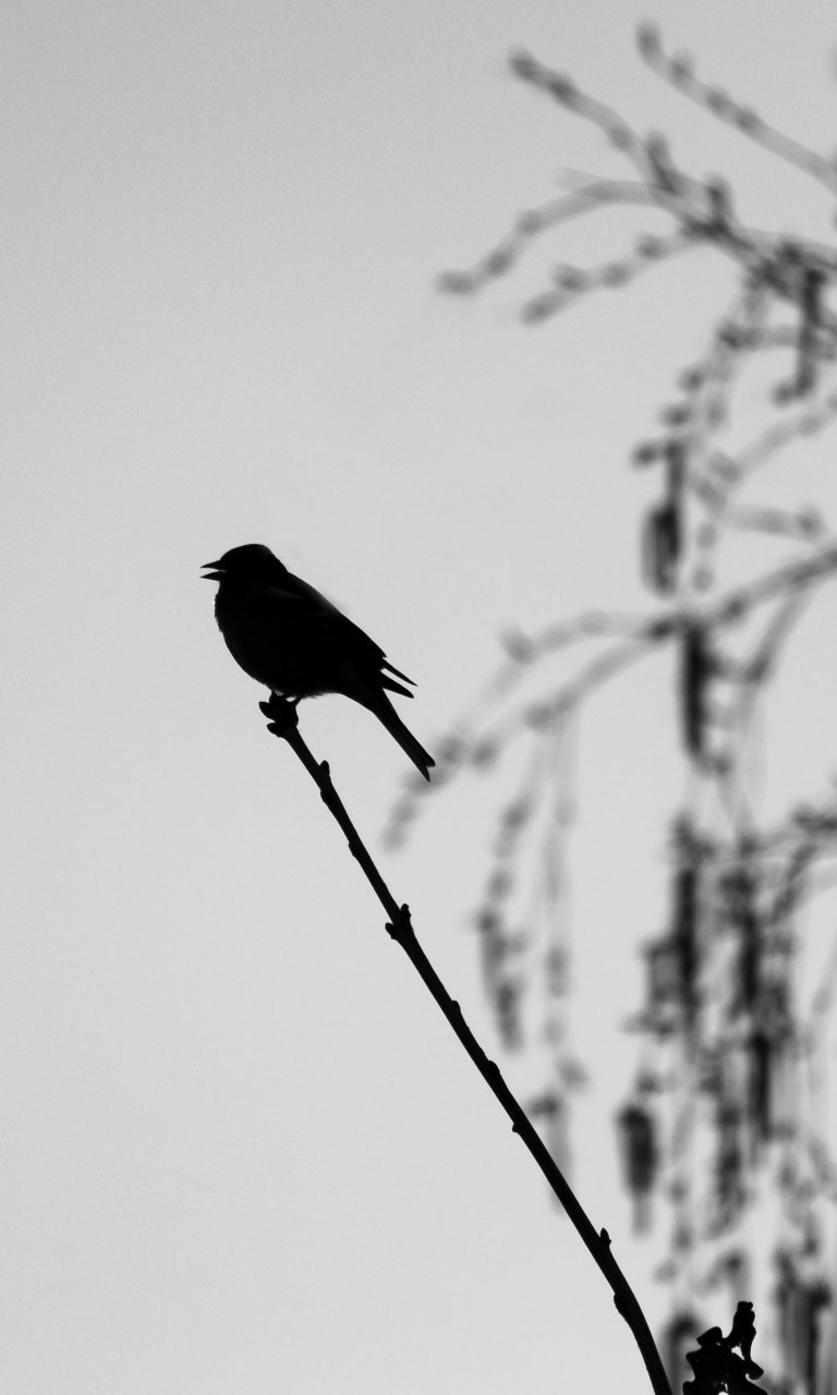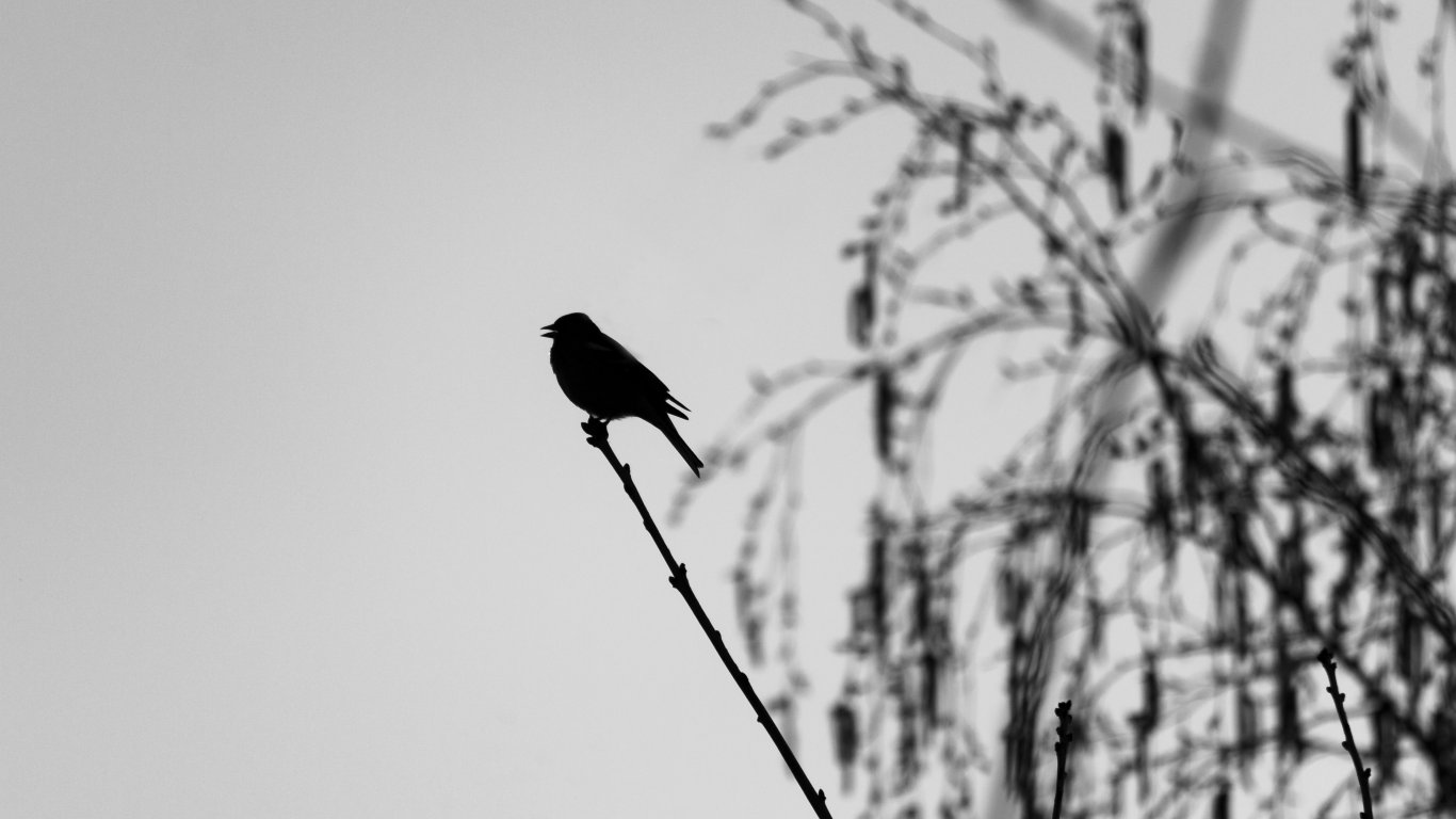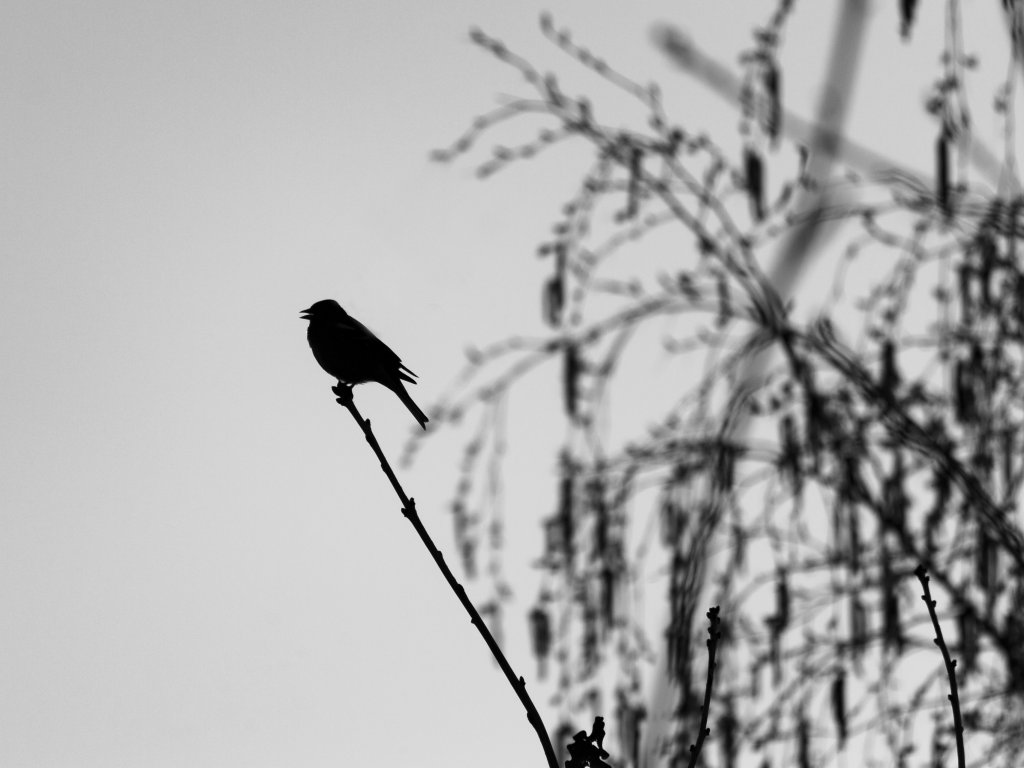 Unser Hintergrundbild zeigt eine Kohlmeise im Abendlicht eines schönen Frühlinstages. Auf unserer schwarzweiß Aufnahme ist die Silhouette der Meise im Gegenlicht zu sehen.