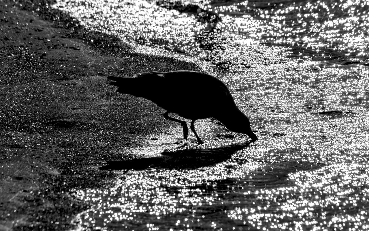 Eine Möwe am Strand der Ostsee. Das Hintergrundbild ist in schwarzweiß um den Effekt des Gegenlichtes und die Spiegelungen im Wasser hervorzuheben.