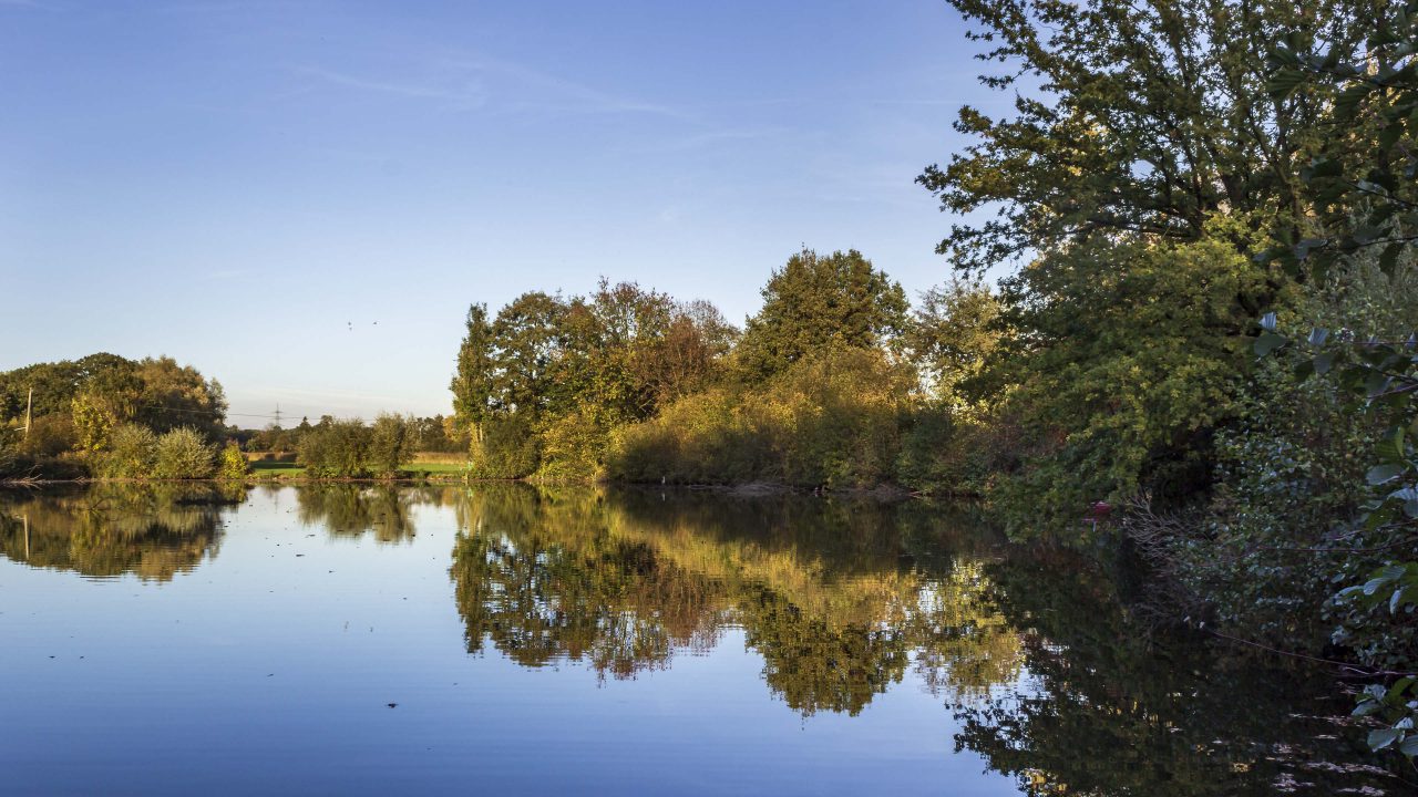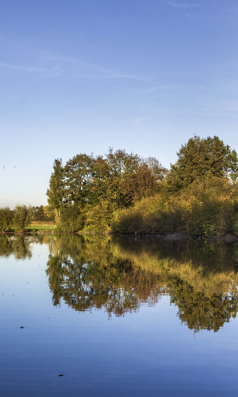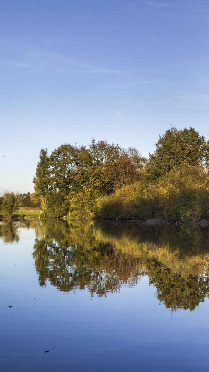 Blick auf den Mühlteich der Tüshaus Mühle in Deuten. Das Wasser ist an diesem tollen Herbsttag so still, dass sich die Uferpflanzen im Wasser spiegeln.