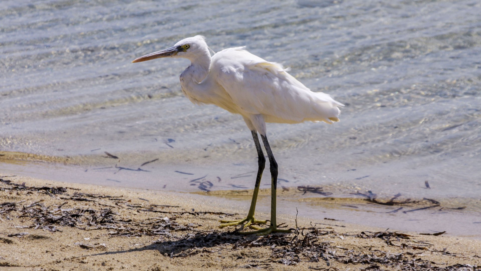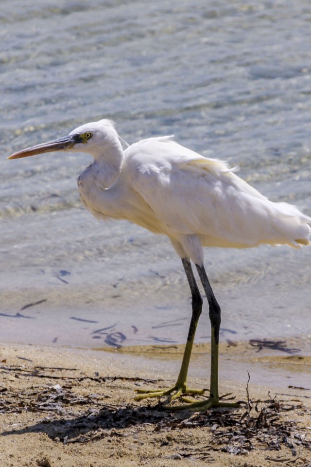 Ein wunderschöner Ägyptischer Reiher am Strand des Roten Meeres. Wir haben diesen erhabenen Vogel in Marsa Alam, in Ägypten, fotografiert. Das Hintergrundbild ist vor allem für Desktop-PCs und Tablets geeignet, da der Reiher auf schmalen Smartphone Displays teilweise stark beschnitten ist.