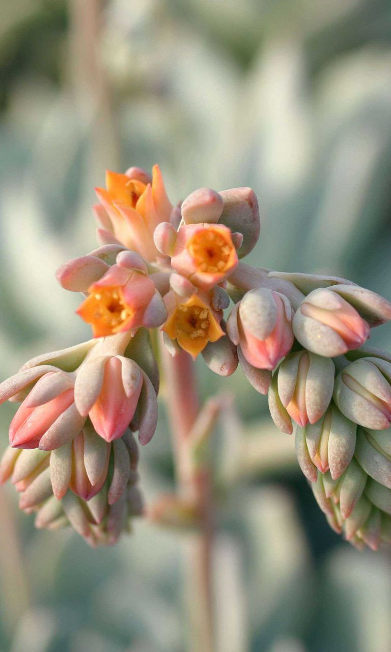 Diese orange Sukkulente beginnt gerade zu blühen. Das Wallpaper ist ein weiteres gutes Beispiel dafür, dass sehr unscheinbare Pflanzen wundervolle Blüten haben können. Die Nahaufnahme für dieses Hintergrundbild entstand an einem Sommertag in Denia, Spanien.