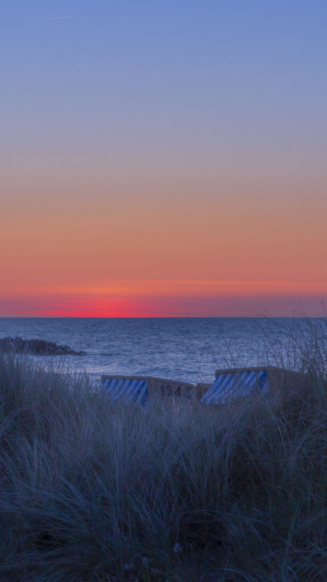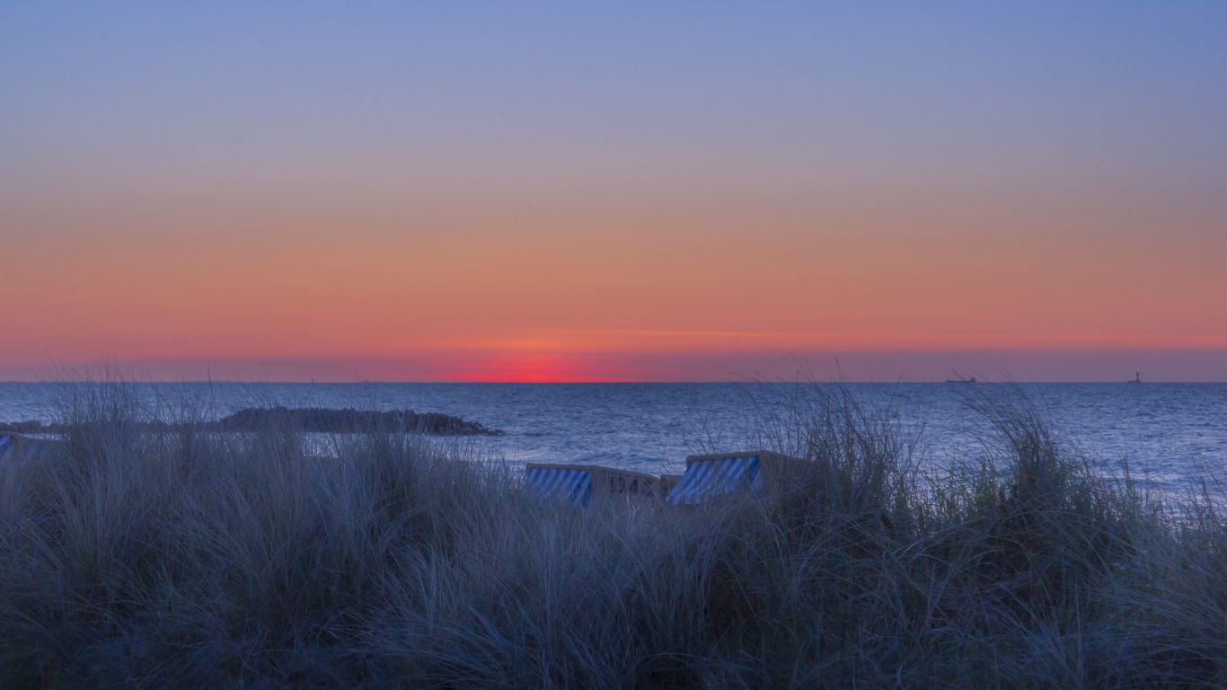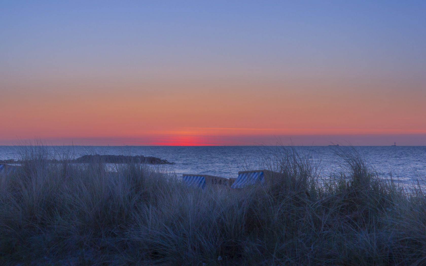 Blick über die Dünen auf die Ostsee und den Abendhimmel kurz nach dem Sonnenuntergang. Das Hintergrundbild entstand im Frühjahr am Schönberger Strand.