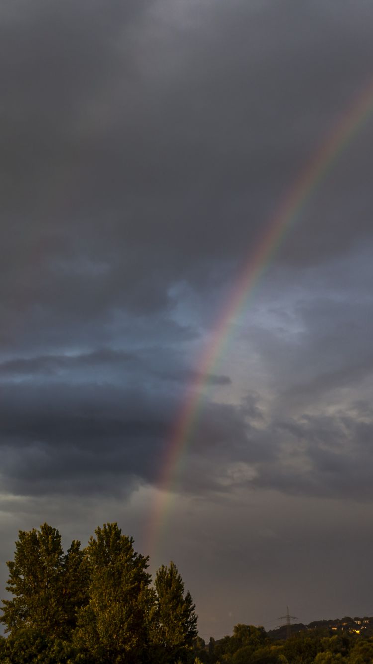 Regenbogen nach einem Gewitter. Das Hintergrundbild entstand an einem verregneten Sommerabend an der Ruhr in Bochum.