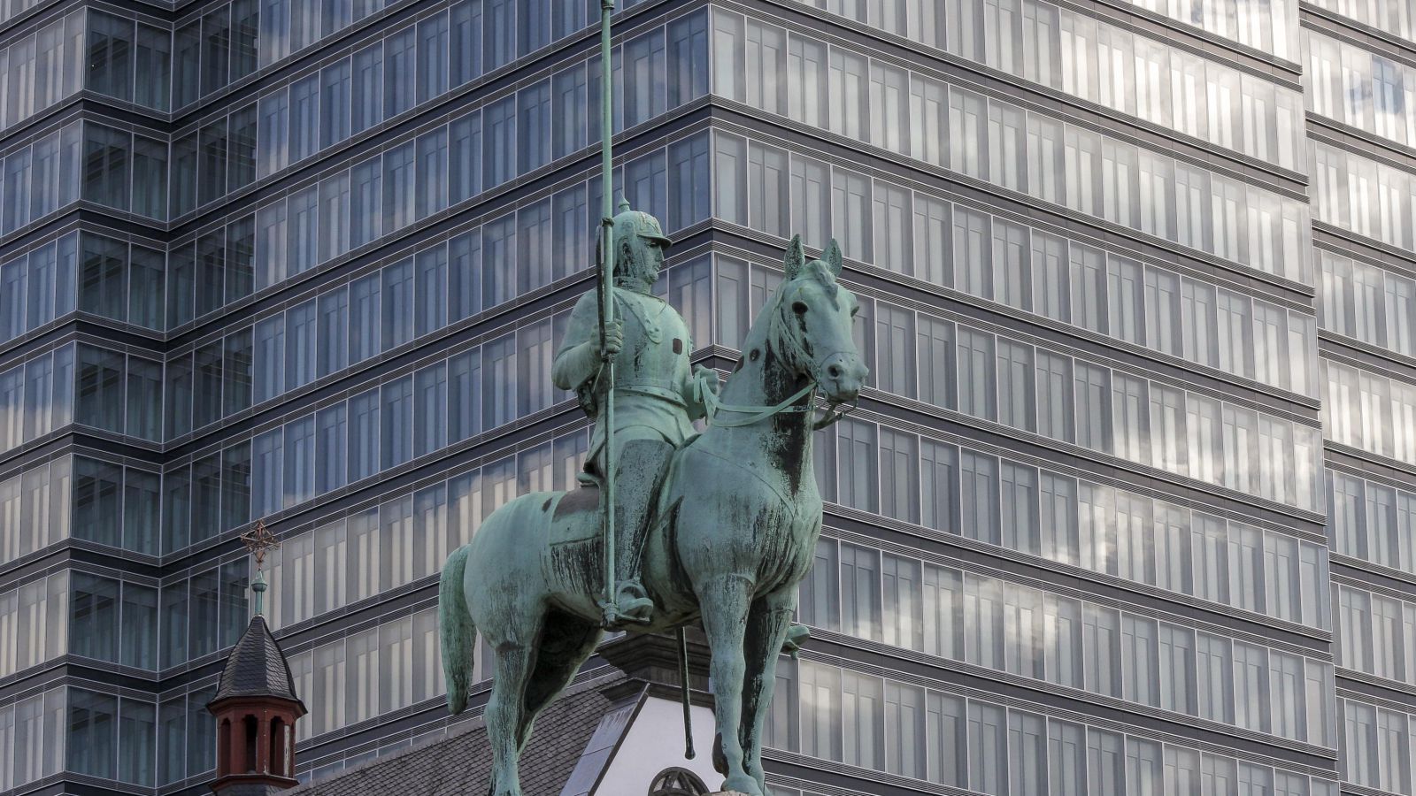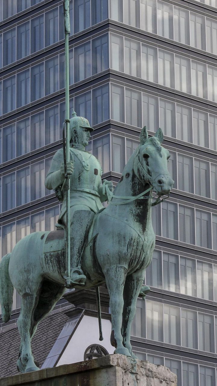 Das Reiterdenkmal für das Kürassier-Regiment „Graf Gessler“ vor dem Lanxess Tower. Der Reiz in der Aufnahme liegt auch im Kontrast zwischen historischer und moderner Architektur.