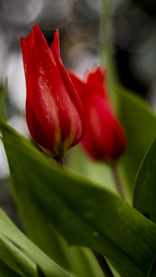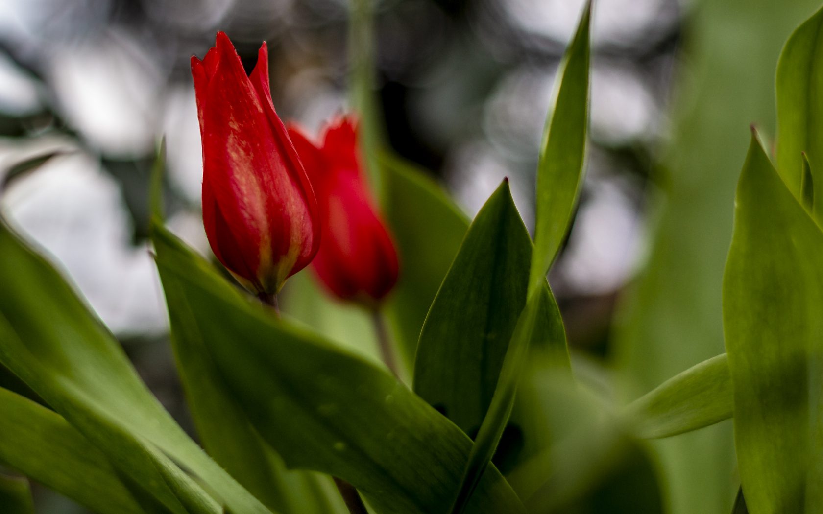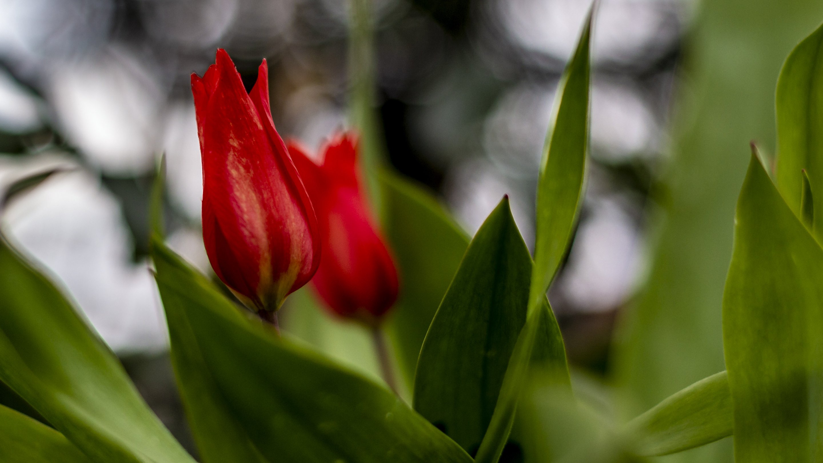 Tulpen gehören zu den beliebtesten Frühlingsboten. Unsere Nahaufnahme zeigt zwei hübsche rote Exemplare in einer Nahaufnahme.