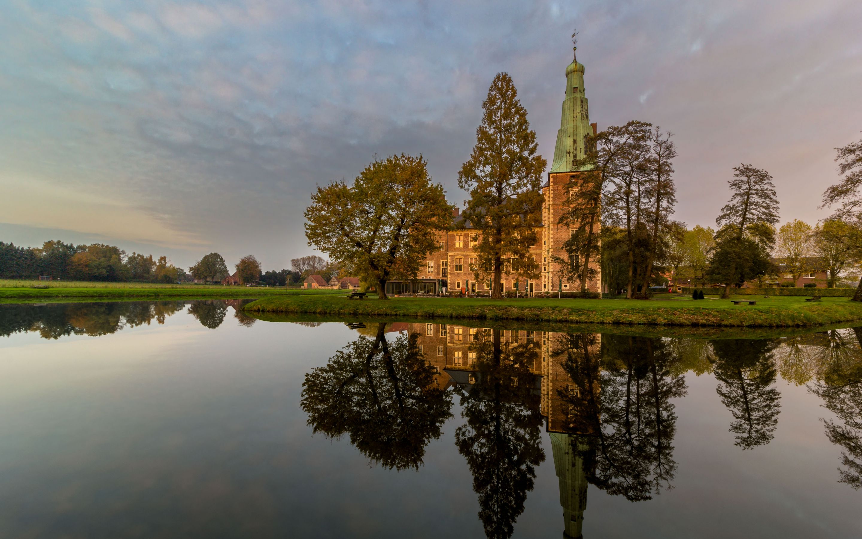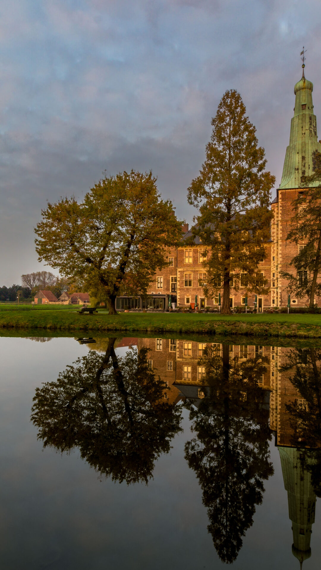Das Schloss Raesfeld kurz nach dem Sonnenuntergang. Das Hintergrundbild entstand an einem ruhigen Herbstabend im November.