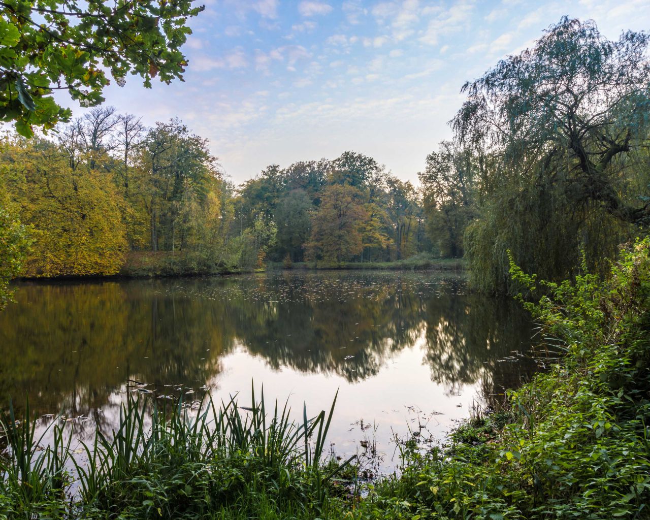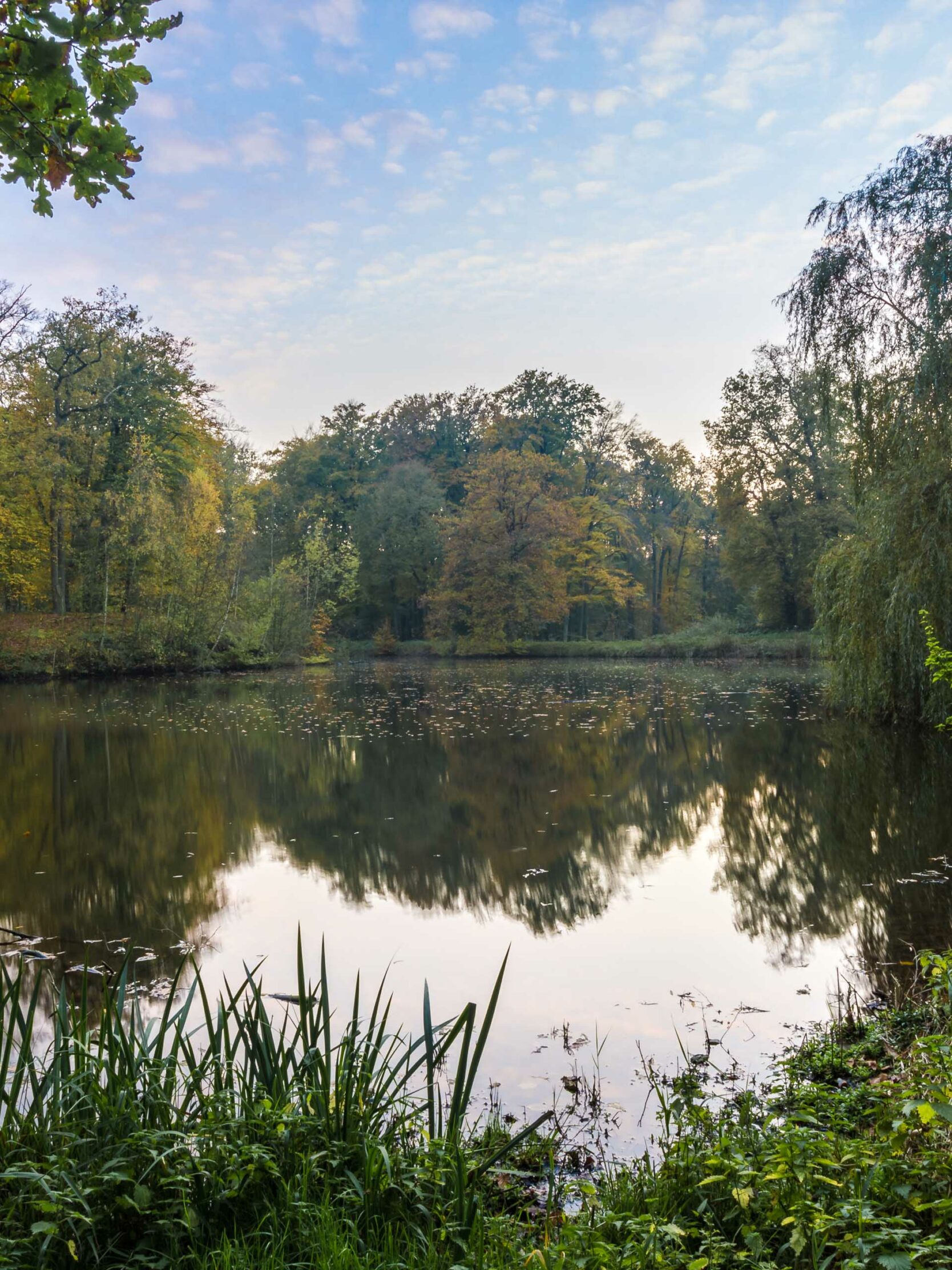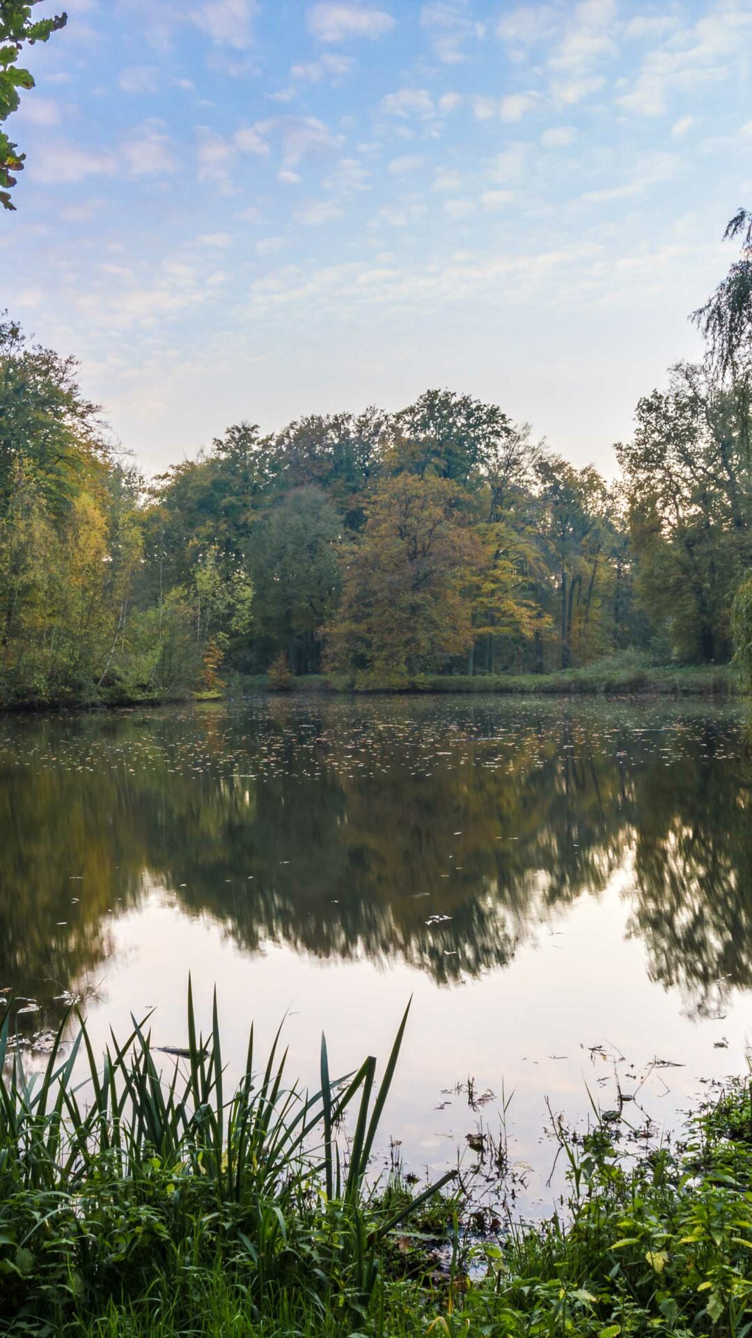 Unser Hintergrundbild zeigt einen Teich im Schlossgarten von Schloss Raesfeld. Die Aufnahme entstand an einem ruhigen Herbstabend nach dem Sonnenuntergang.