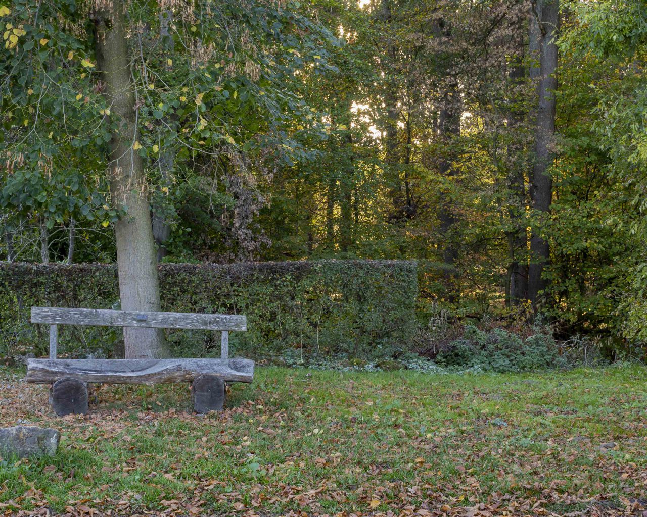 Auch hier lässt es sich gut Ausruhen. Eine Sitzbank unter Bäumen am Waldrand lädt zum Verweilen ein. Das Hintergrundbild entstand an der Tüshaus Mühle in Deuten.