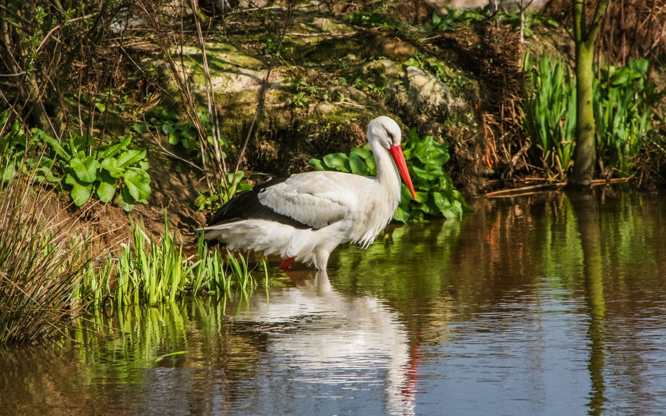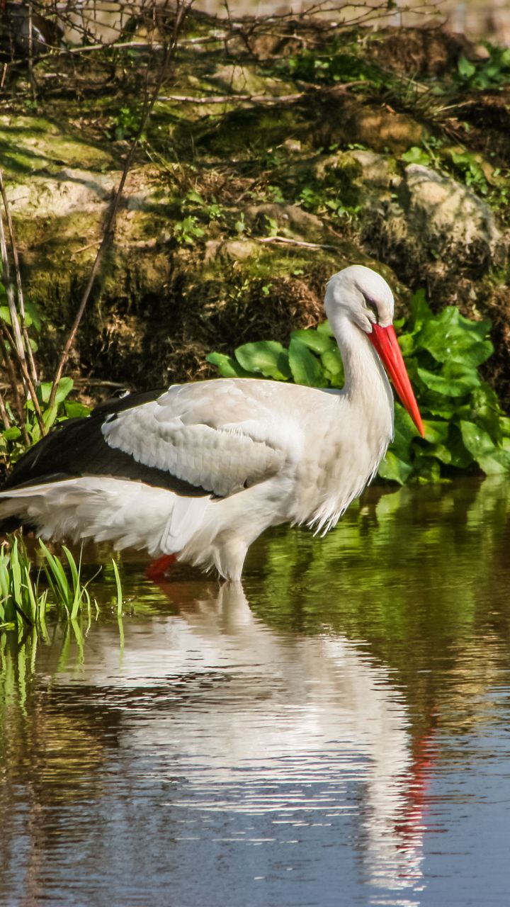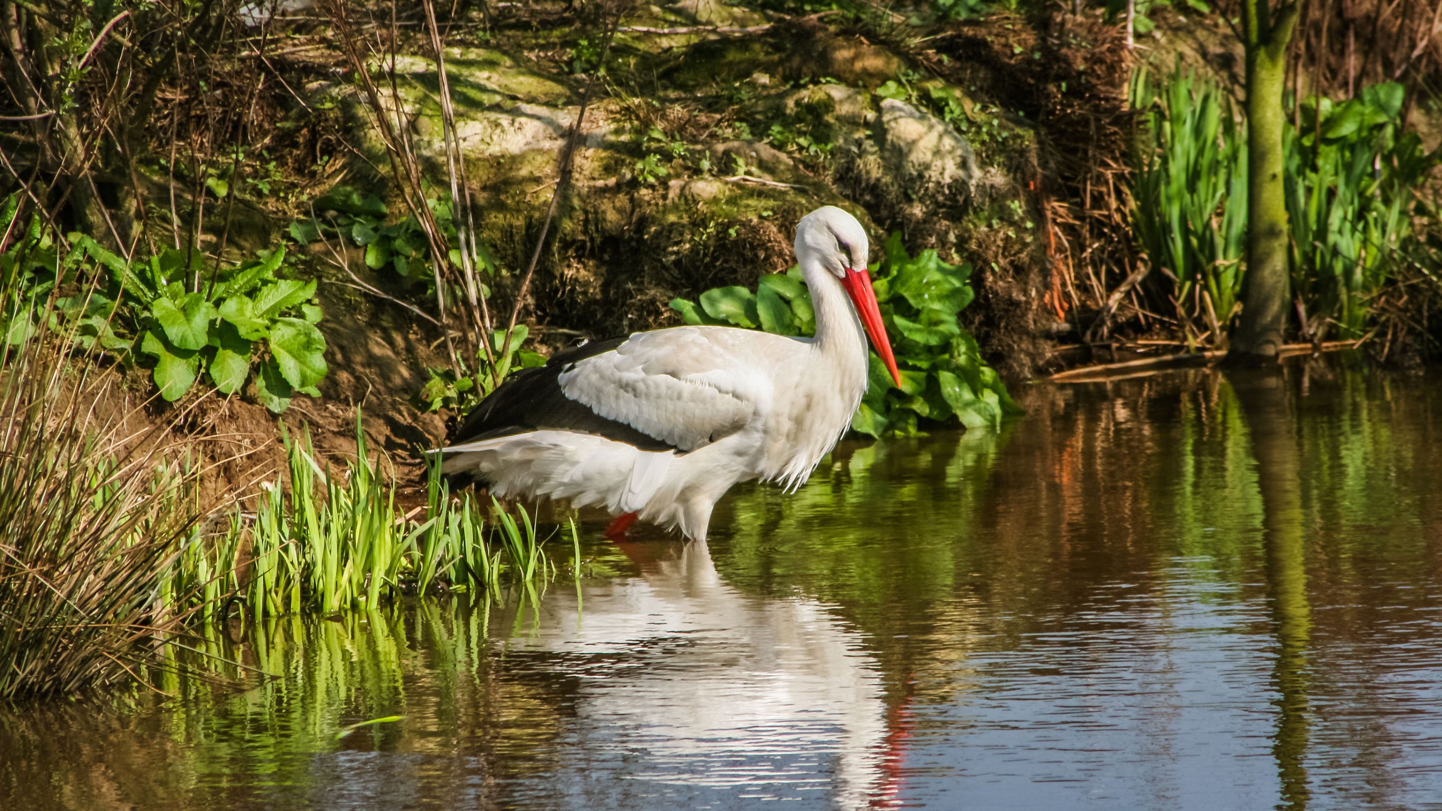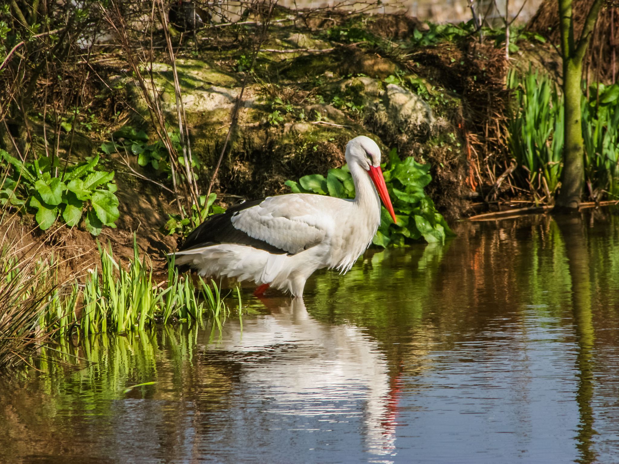 Ein Storch am Ufer eines Sees auf Futtersuche. Sieht nicht so aus, als ob er schon erfolgreich gewesen wäre.