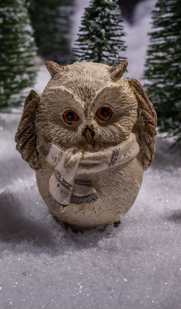 Hintergrundbilder zu Weihnachten. Eine kleine Eule steht, umringt von Tannen im Schnee. Auch ein sehr schönes Motiv für den Advent.
