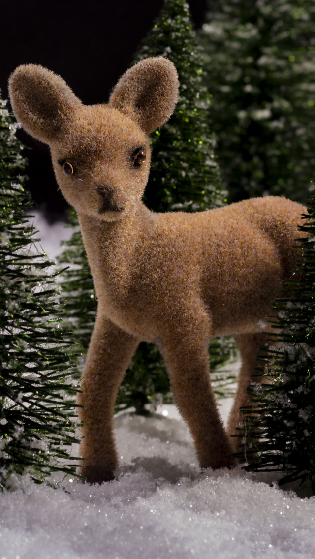 Hintergrundbilder zu Weihnachten. Unser Advents Wallpaper zeigt ein Rehkitz in einer verschneiten Landschaft zwischen Tannen.