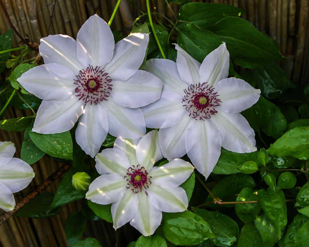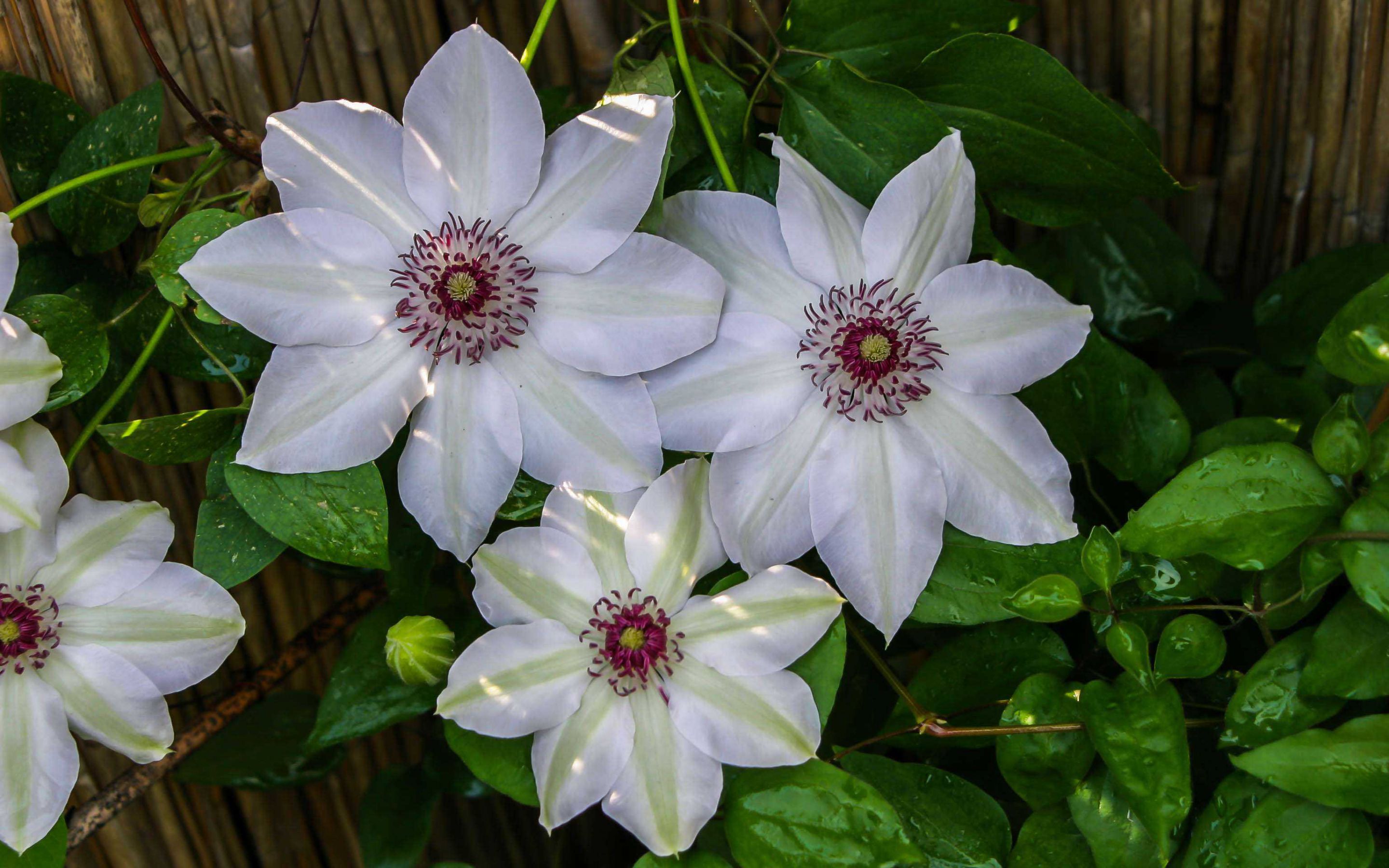 Das Wallpaper zeigt drei weißgrüne Blüten einer Waldrebe in Nahaufnahme. Das Foto für dieses Hintergrundbild entstand an einem schönen Frühlingstag.