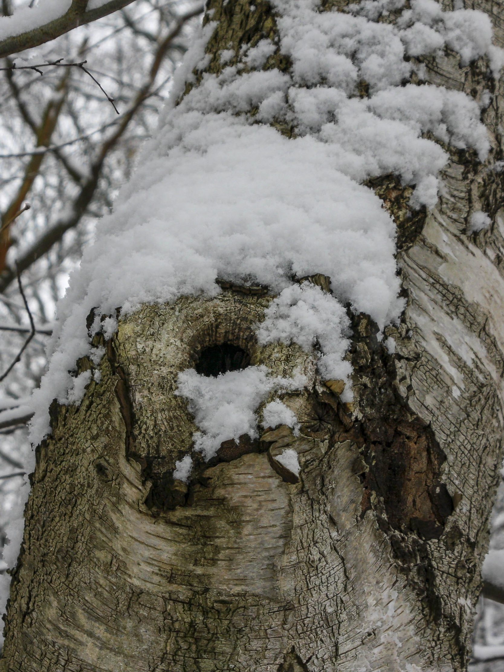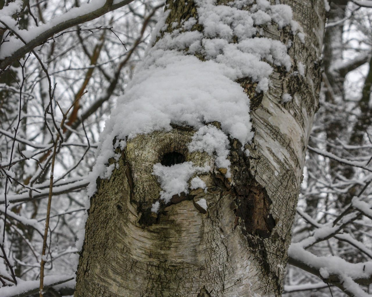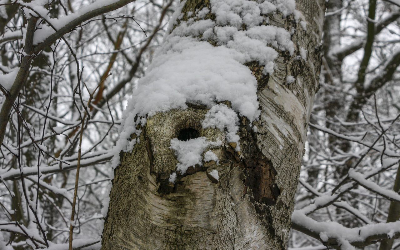 Nahaufnahme eines Birkenstammes mit einem Astloch. Wer hier wohl wohnt? Unser Hintergrundbild entstand an einem kalten Wintertag in Dorsten.