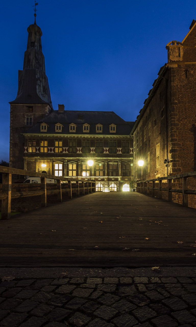 Blick über die Brücke zum Westflügel der Oberburg von Schloss Raesfeld. Unser Hintergrundbild entstand an einem ruhigen Novemberabend zur Blauen Stunde.