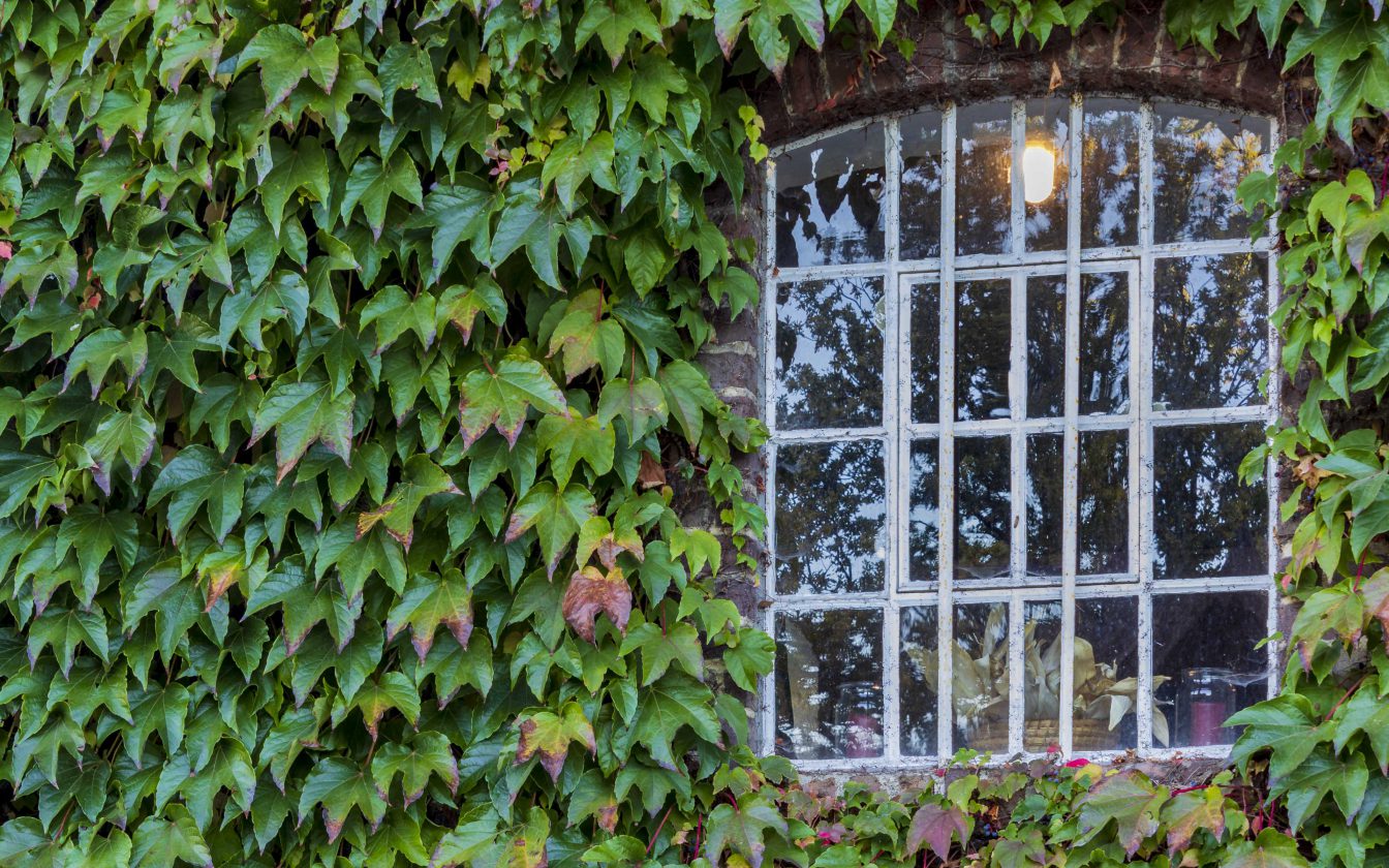 Ein Mühlenfenster der Tüshaus Mühle, dass von wildem Wein umrahmt ist. Das Hintergrundbild entstand an einem schönen Herbsttag im Oktober.