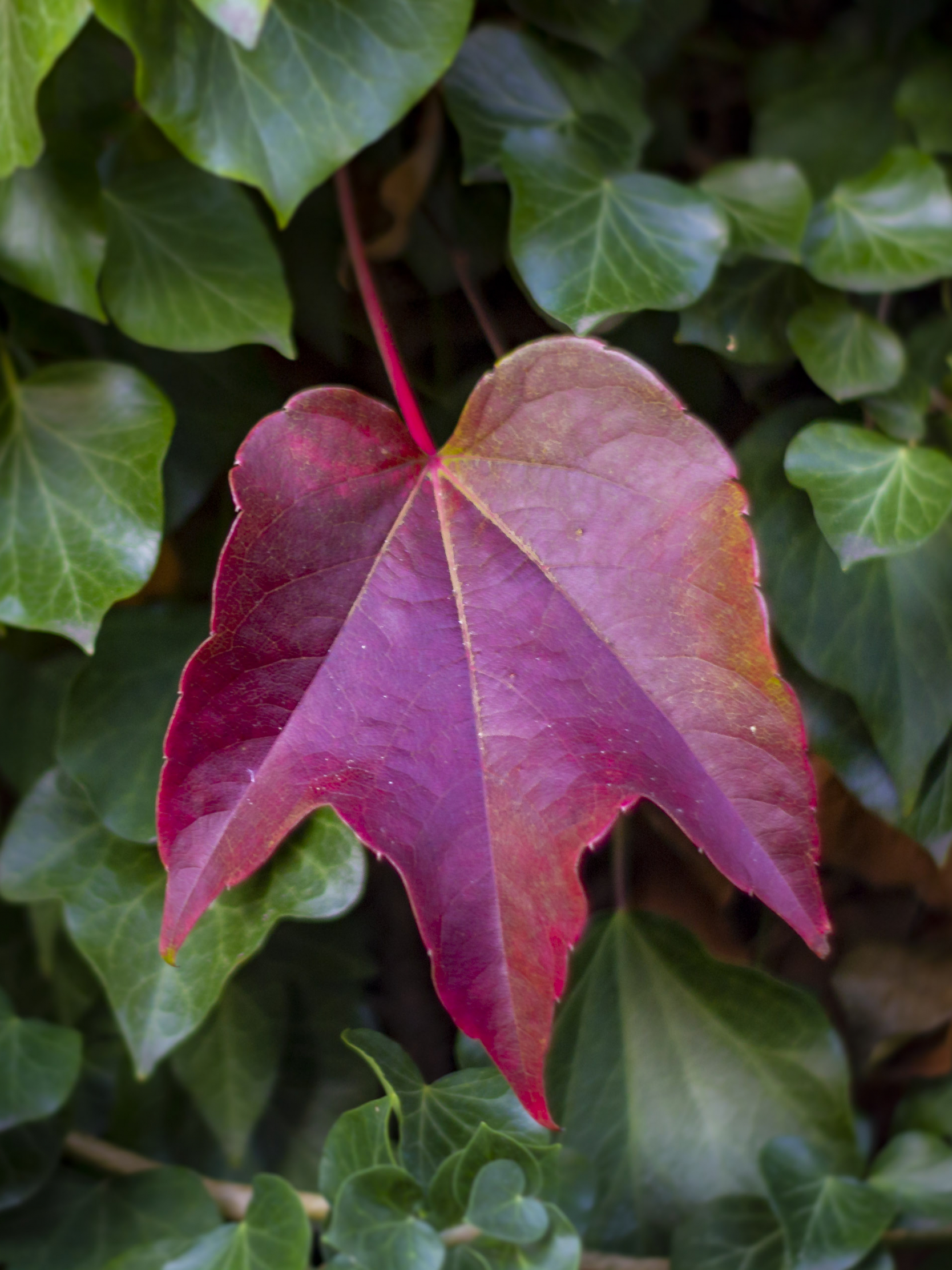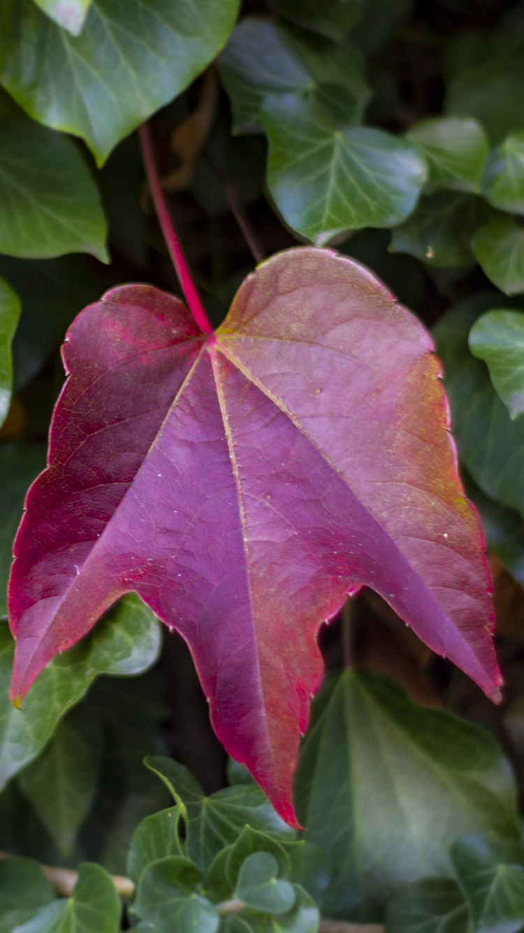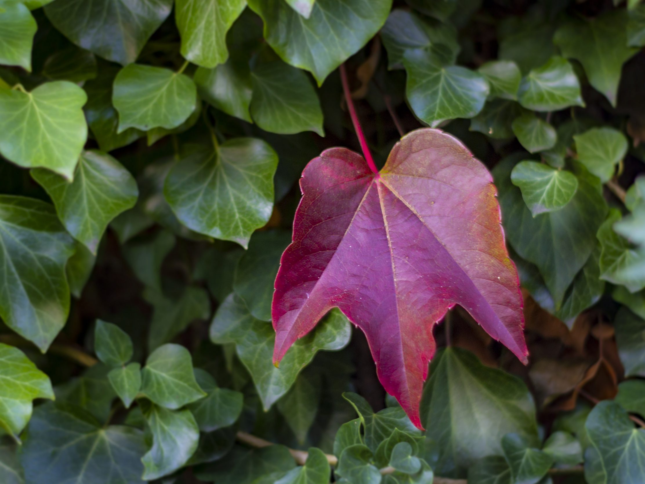 Wilder Wein vor einem grünen Hintergrund aus Efeu. Das Hintergrundbild zeigt das schöne rote Blatt des Wilden Weins vor vielen tiefgrünen Efeublättern.