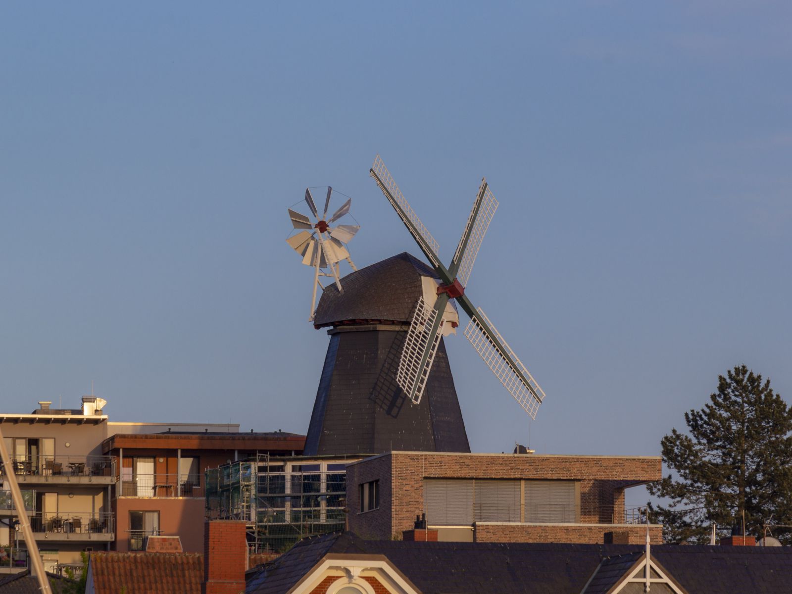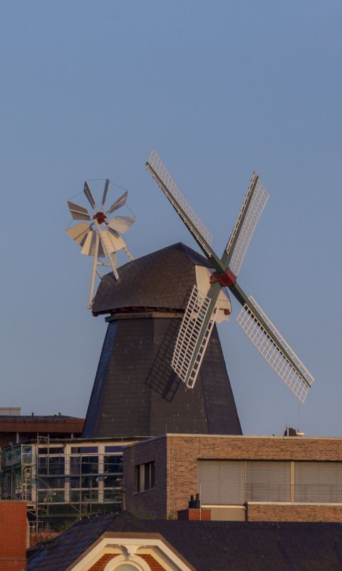 Blick vom Hafen auf die historische Windmühle von Laboe. Das Hintergrundbild entstand an einem schönen Frühlingsabend im Mai.