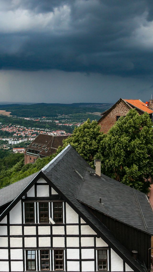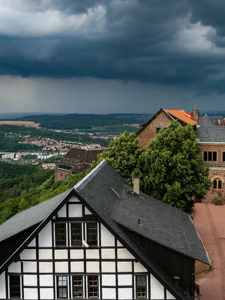 Blick vom erhaltenen Südturm der Wartburg über den Burghof in Richtung Norden. Dort ziehen dunkle Wolken auf. Rechts ist der Bergfried zu sehen. Dort fanden leider zum Zeitpunkt der Aufnahme Bauarbeiten statt.